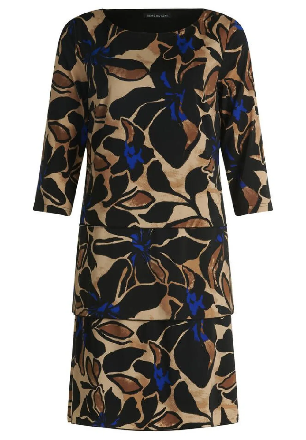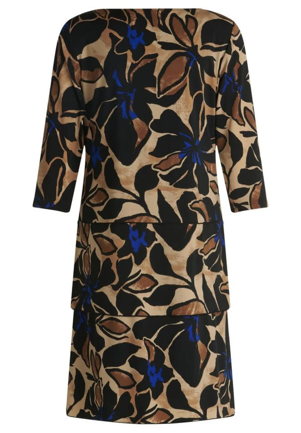 Kaunis lehtikuosinen polvipituinen trikoomekko trendikkäällä kerroksellisella helmalla ja 3/4 hihoilla. Suora malli.L…