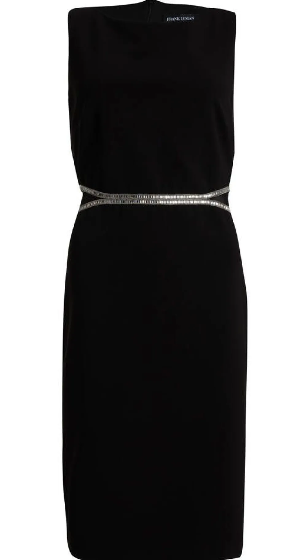 Naisten hihaton polvipituinen kotelomekko. Vyötäröllä on yksityiskohtina kaksi timanttipantaa ja sivuissa läpinäky…