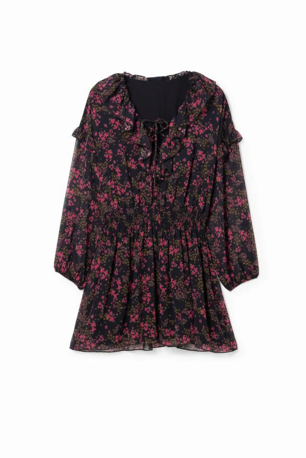 Kaunis sifonkimekko pienellä kukkakuosilla, pitkillä hihoilla ja vyötärön smokkirypytyksillä. Pääntiellä on rö…