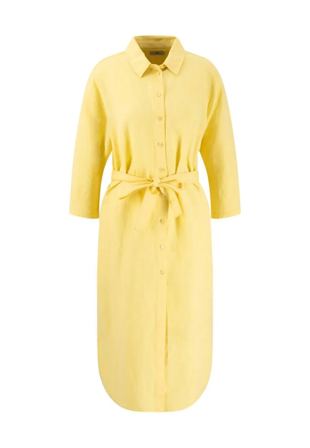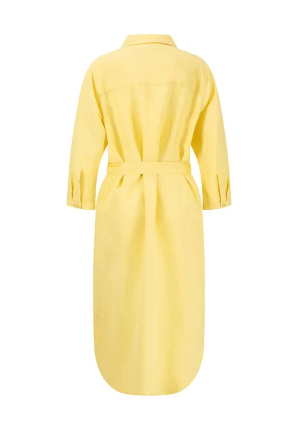Raikkaan värinen pellavasekotteinen edestä napitettava mekko, jossa on klassinen kaulus. Vyötäröllä on solmittava …