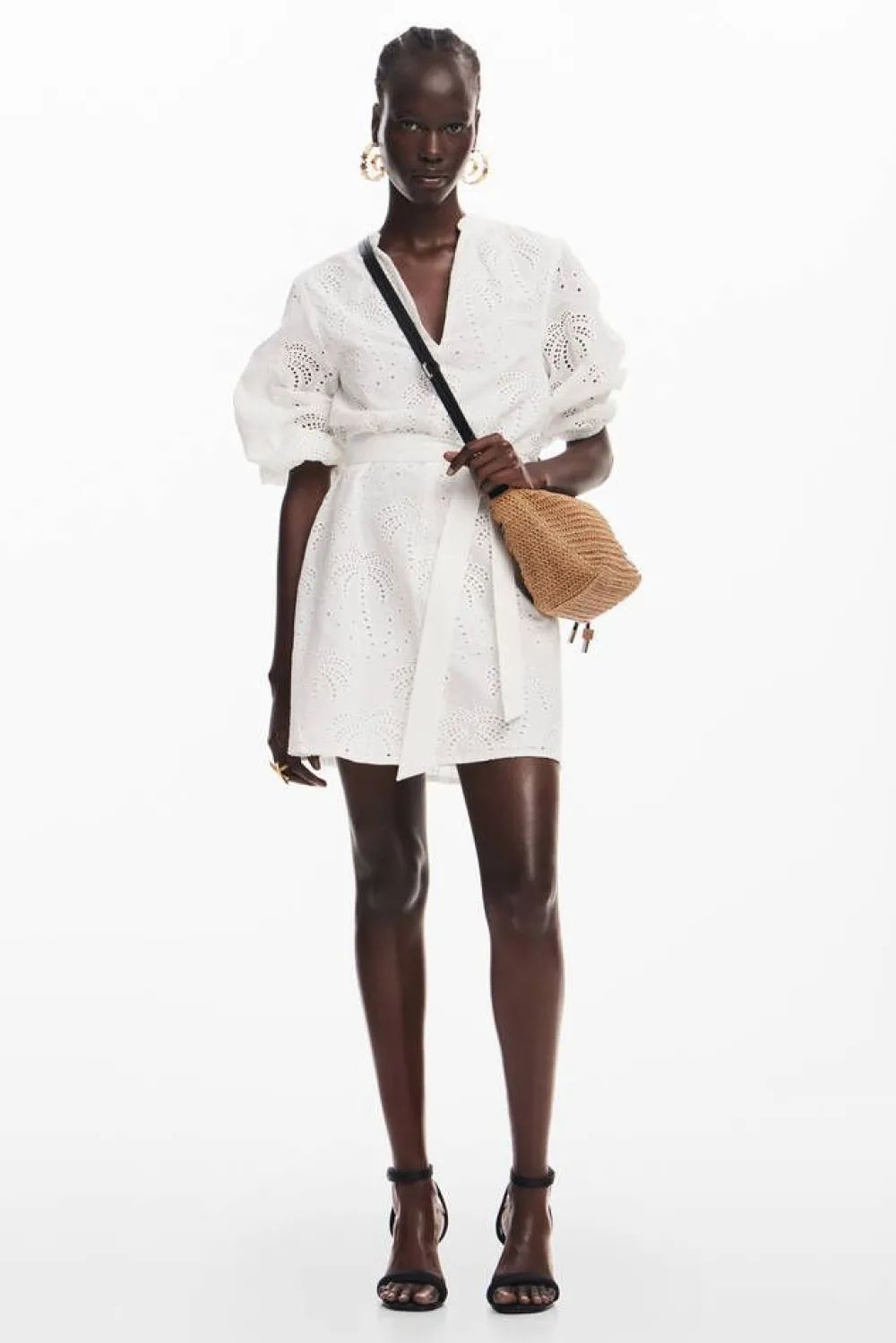 Ajattoman trendikäs pitsikuvioinen mekko 3/4 hihoilla. Edessä on naisellinen v-pääntie ja sen alla kolme nappia. Lev…