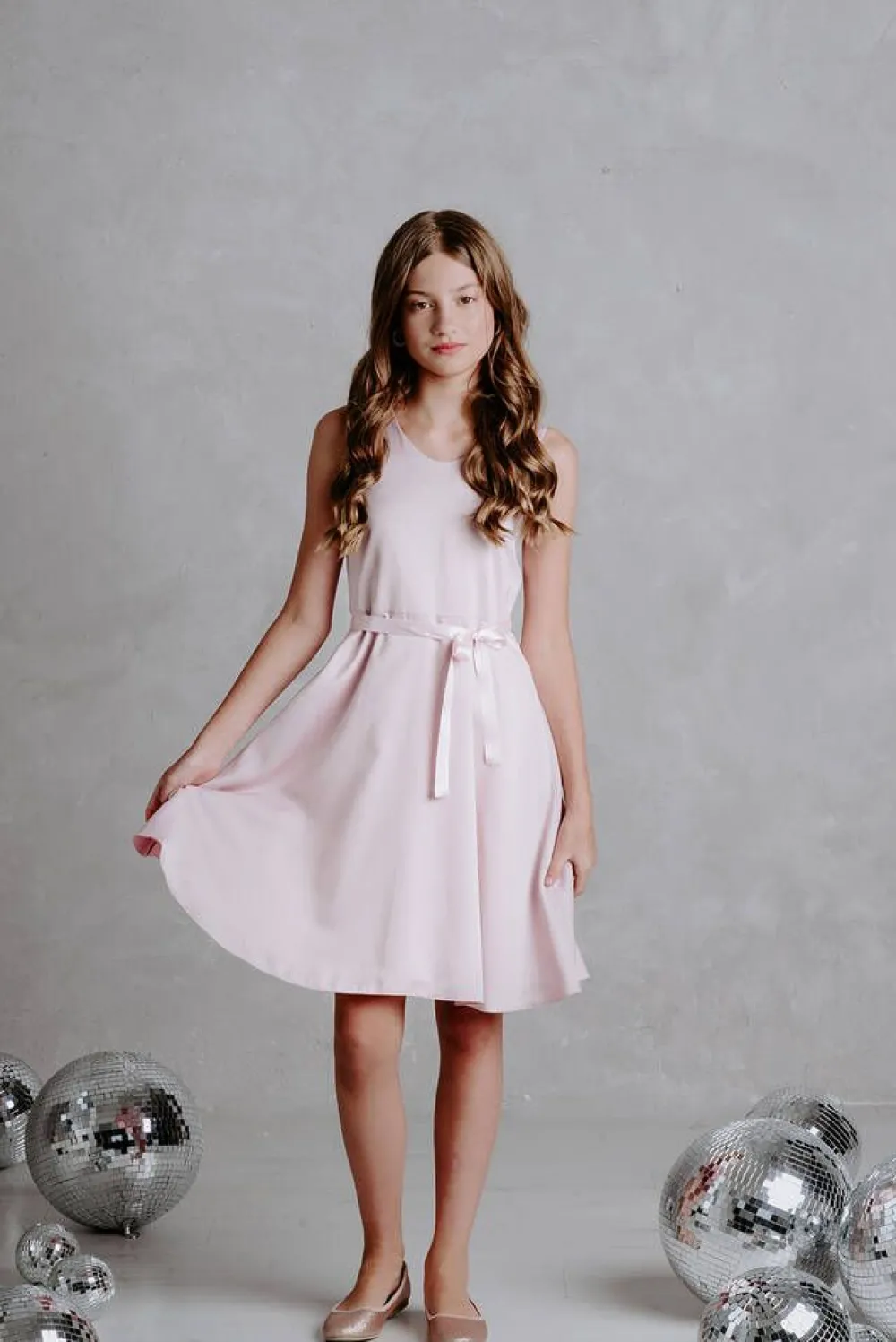 Hihaton sifonkimekko, jonka vyötäröllä on solmittava vyö. Selkäpuolella on pukemista helpottava vetoketjukiinnitys…