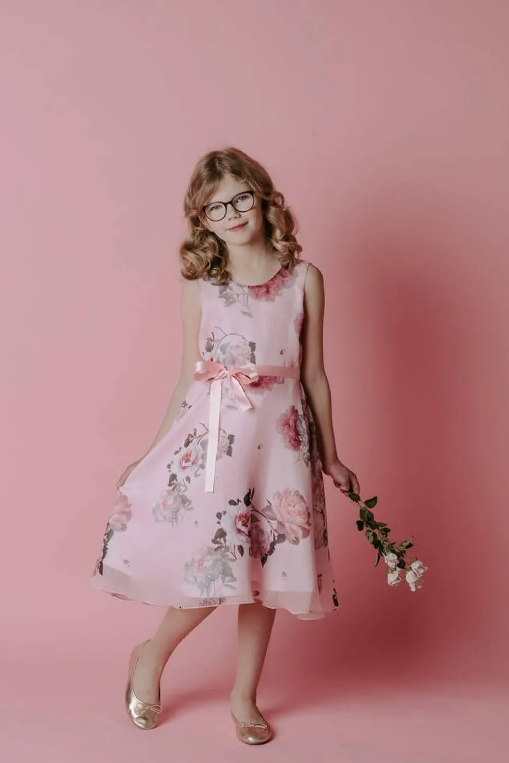 Lasten sifonkimekko kukkakuosilla. Mekossa on satiinivyö vyötäröllä.Lisää tietojaValmistettu VirossaHoito-ohje:Ve…