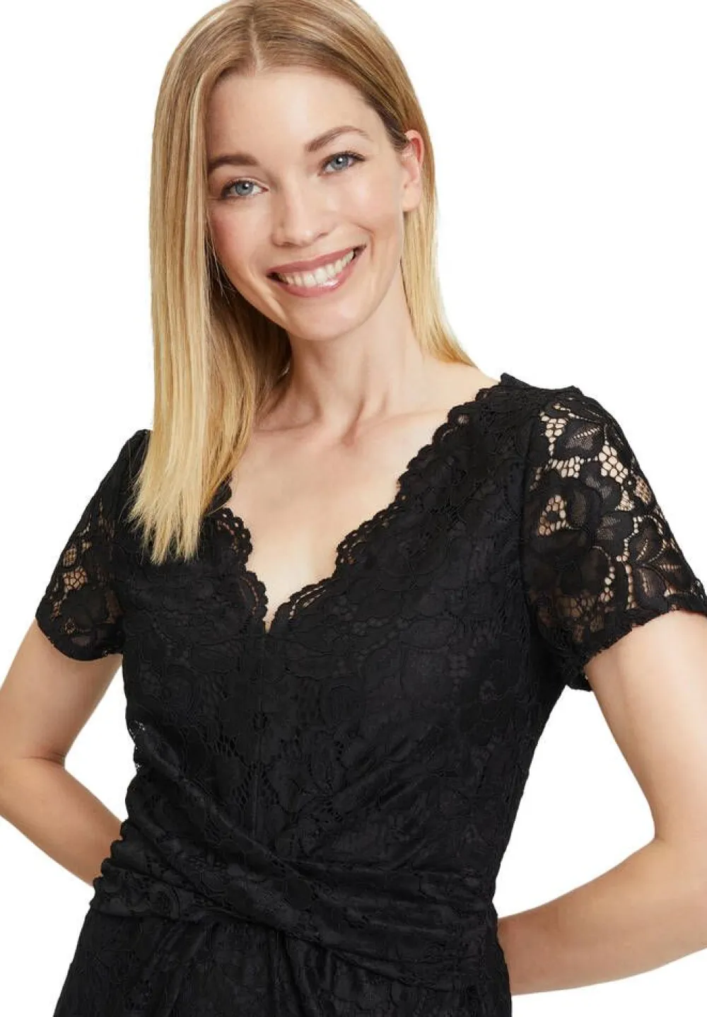 Ihana pitsimekko V-pääntiellä ja lyhyillä hihoilla. Vyötäröllä kangas menee tyylikkäästi ristiin ja selkäpuol…