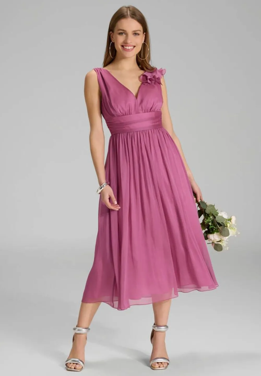 Naisellinen sifonkimekko v-pääntiellä ja avaralla selällä. Toisella olkapäällä on sifonkikoriste ja vyötäröll…