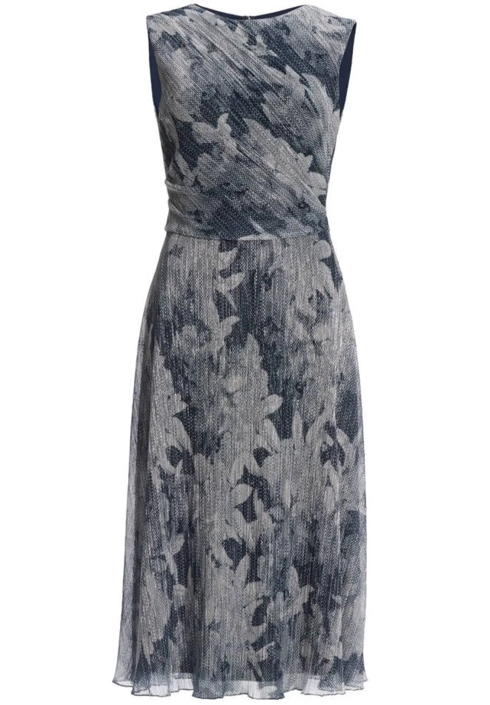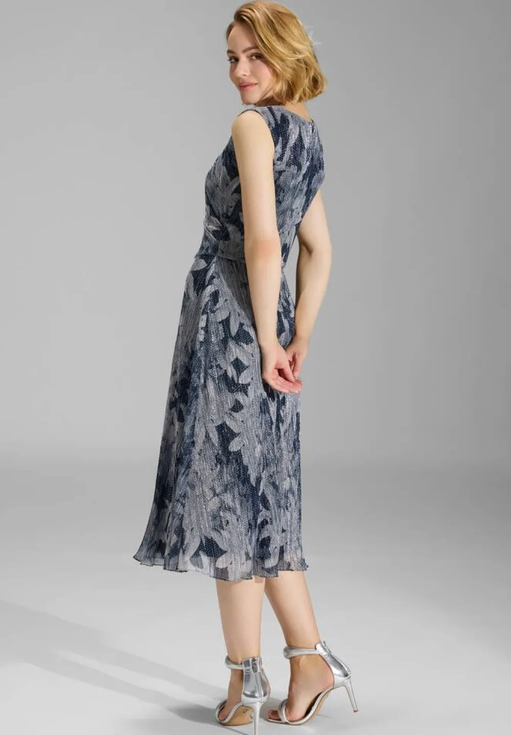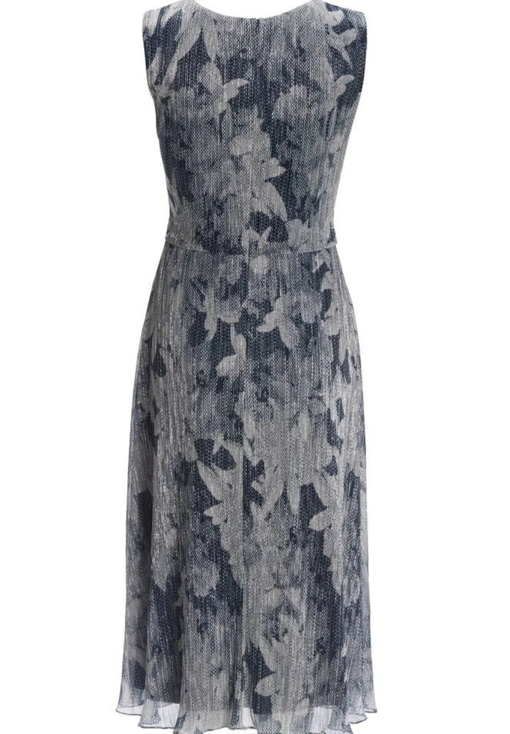 Naisellinen hihaton midimekko hennosti hohtavalla hopeisella kukkakuosilla. Vyötäröllä on imartelevaa rypytystä.Lis…