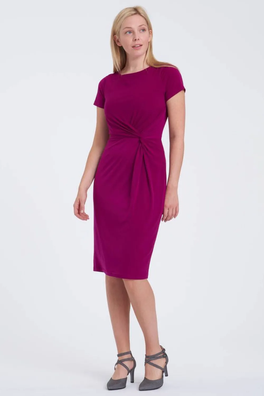 Miellyttävän joustava yksivärinen mekko lyhyillä hihoilla. Vyötäröllä on muotoa antava solmuke ja selässä kaun…