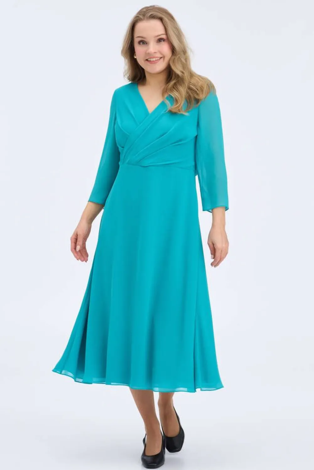 Juhlava ja kevyt sifonkimekko imartelevalla kietaisuyläosalla trendikkäässä turkoosin sävyssä. Läpikuultavat 3/4-…