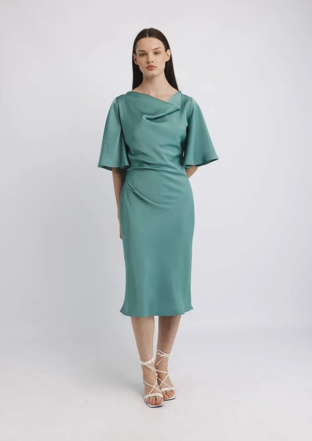 Upean elegantti yksivärinen satiinimekko, jossa pehmeästi laskeutuva vesiputouspääntie ja lyhyet enkelihihat luovat …