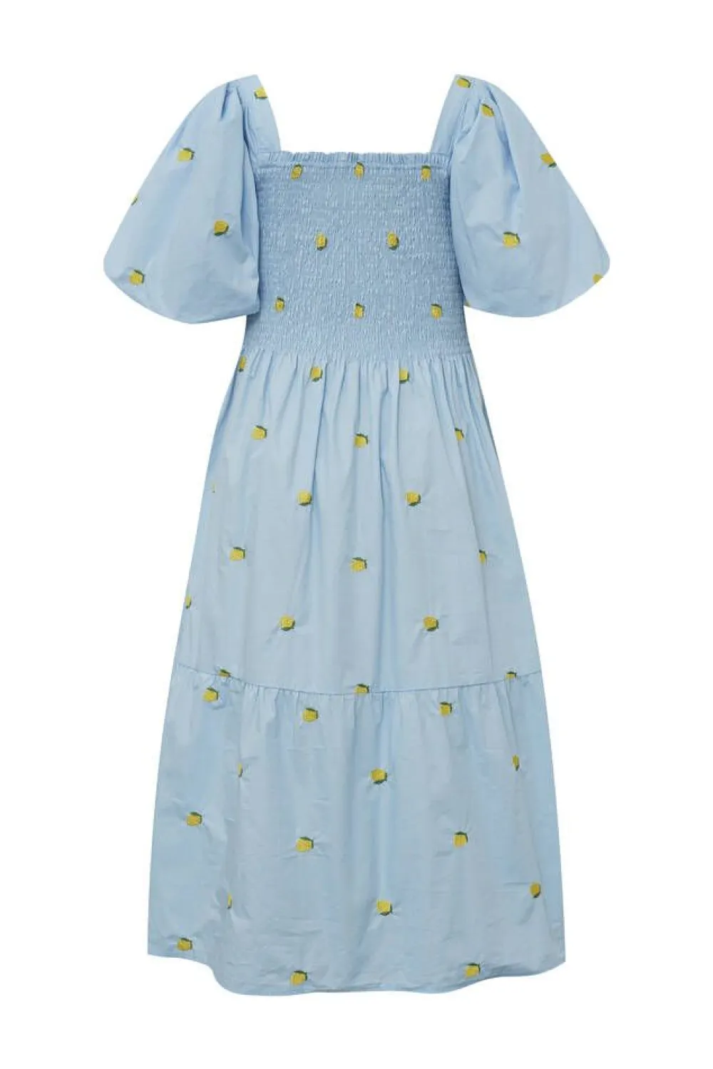 Trendikäs kesäinen puuvillamekko romanttisella muotoilulla. Imarteleva smokkirypytetty yläosa, jota tasapainottaa nä…