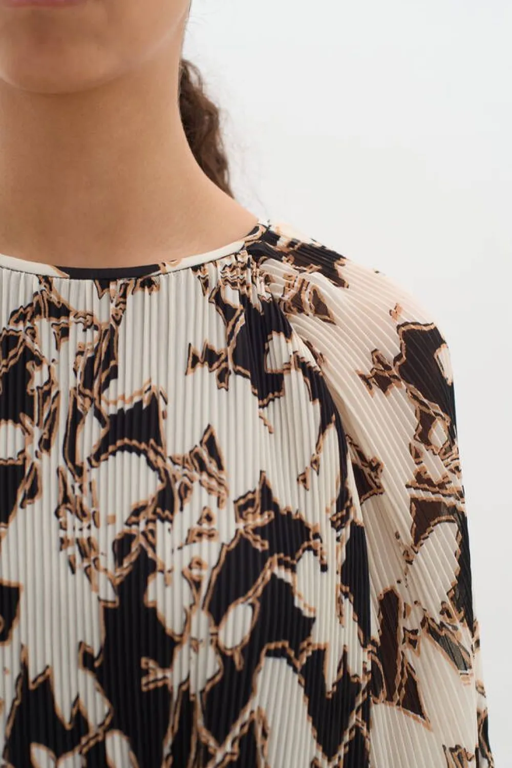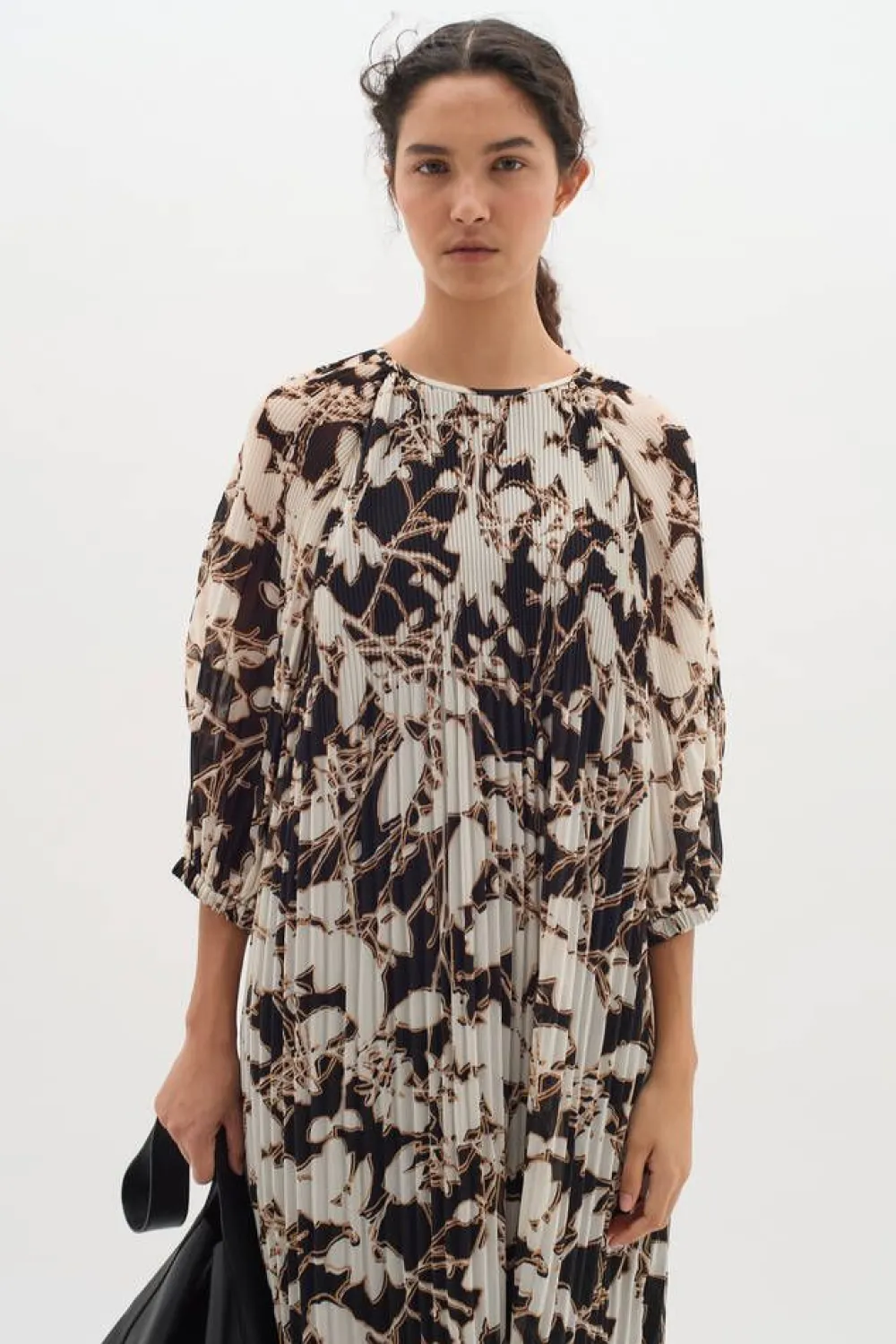 Pliseerattu printtimekko väljällä mitoituksella. Mekon vajaamittaisissa hihoissa on kuminauhat hihansuissa.Lisää ti…