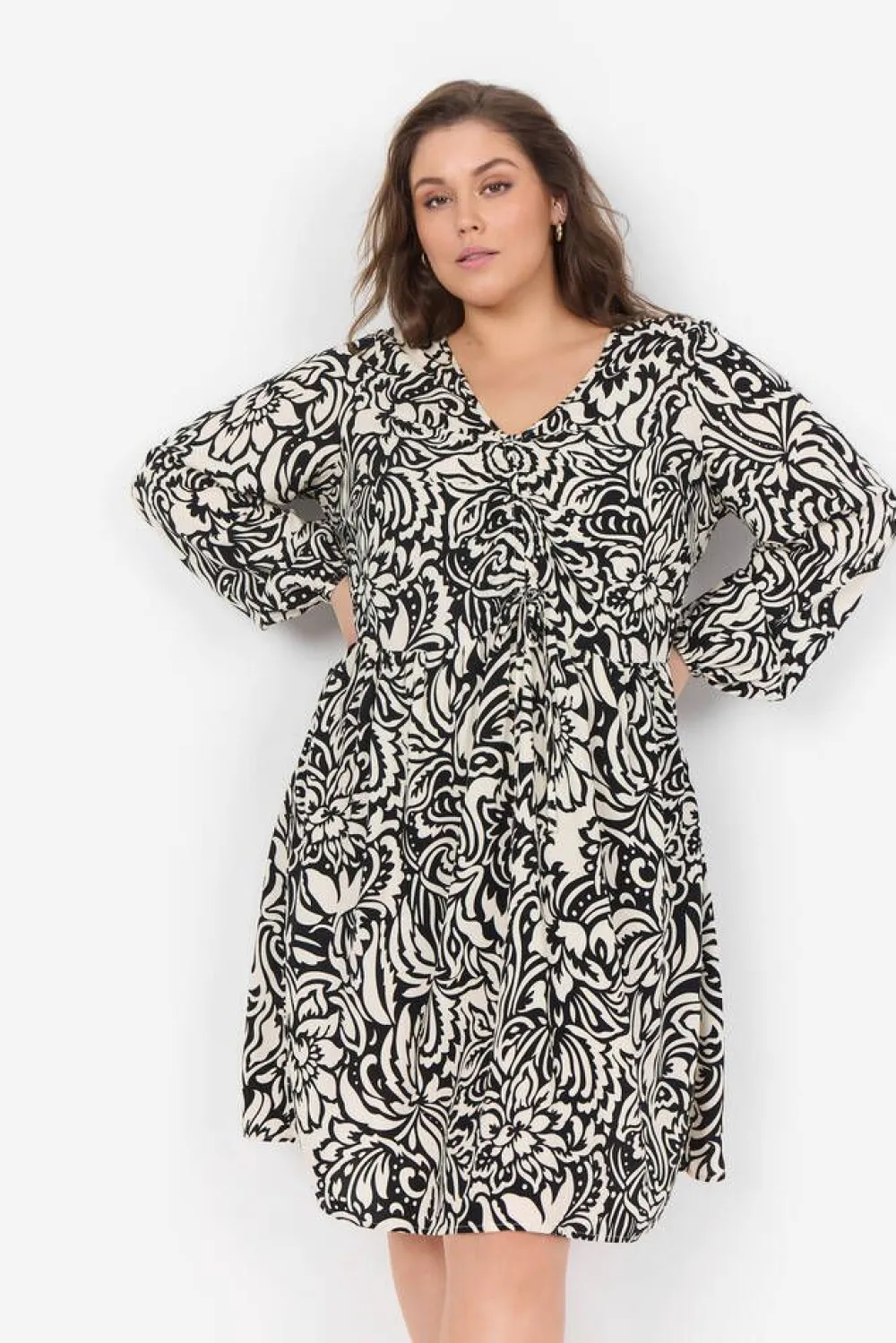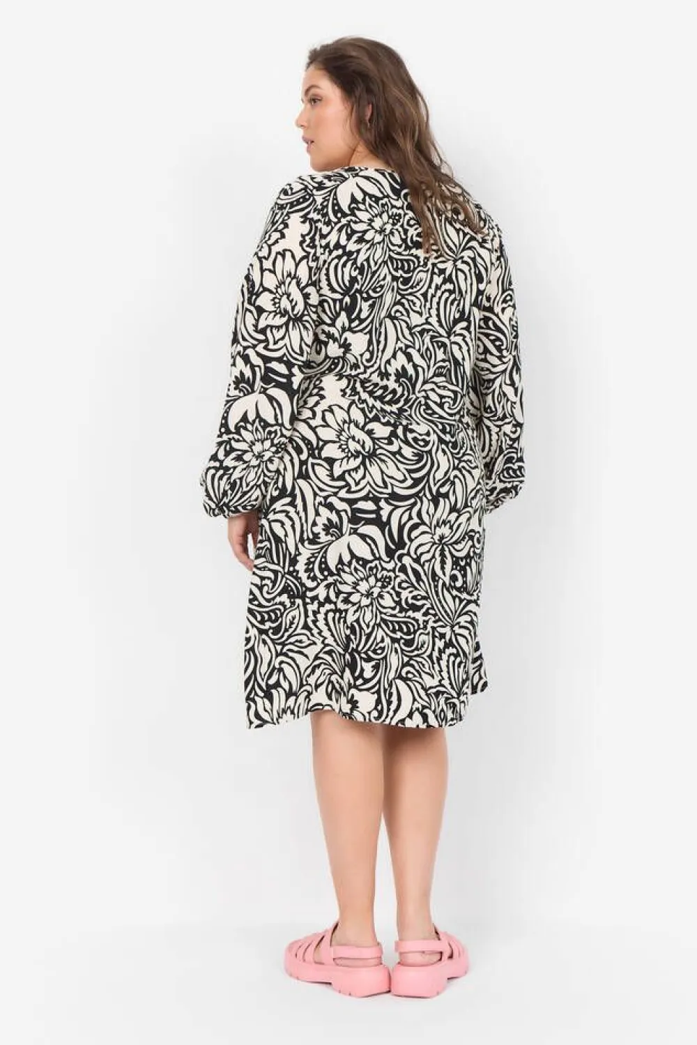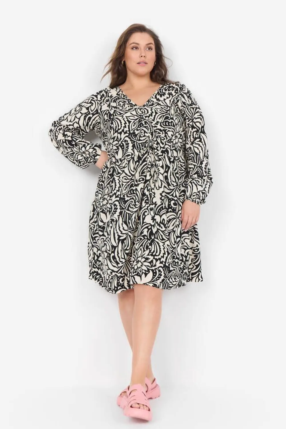 Pitkähihainen viskoosimekko mustavalkoisella kuosilla. Edessä on säädettävä rypytysnauha.Lisää tietojaPlus-mitoi…