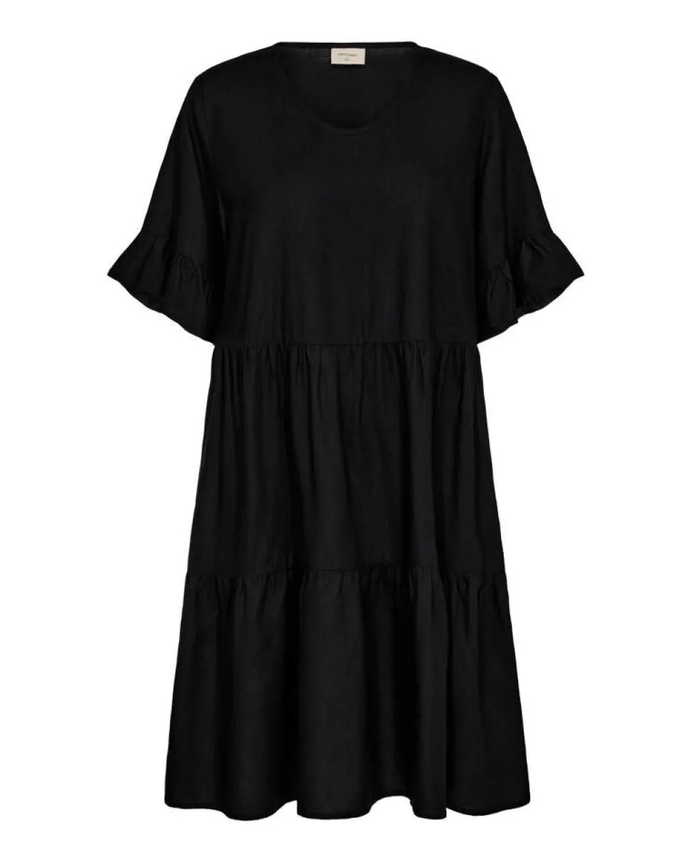 Ihanan kevyt röyhelömekko väljällä istuvuudella ja lyhyillä hihoilla. Helma laskeutuu A-linjaisesti.Lisää tietoj…