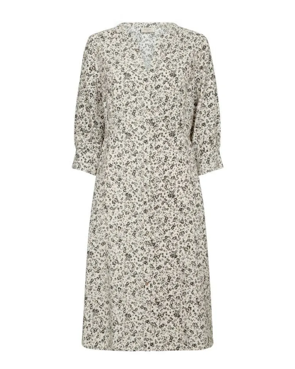 Kevyt ja naisellinen mekko hillityllä kukkakuosilla ja 3/4-hihoilla. V-pääntie ja helmaan asti ulottuva etupuolen nap…