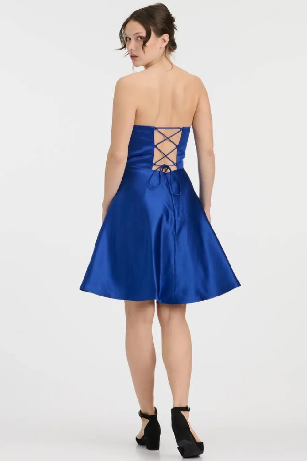 Kaunis koboltinsinen olkaimeton ja kellohameinen satiininen juhlamekko. Takana vetoketjukiinnitys ja ohut nyöritys. Hel…