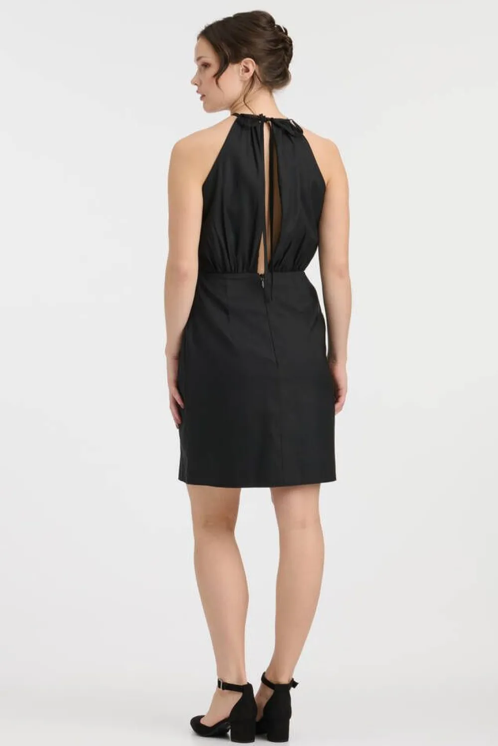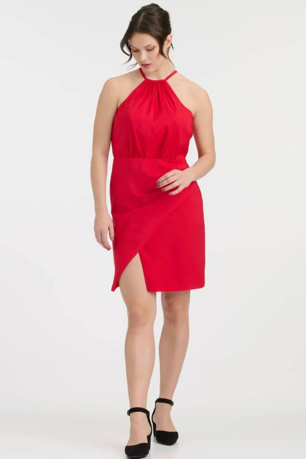 Tyylikäs yksivärinen mekko trendikkäällä halterneck-tyylisellä pääntiellä ja kietaisumallisella alaosalla. Meko…