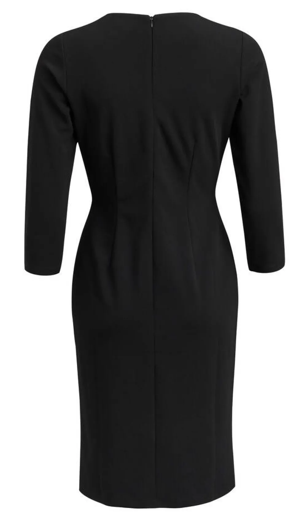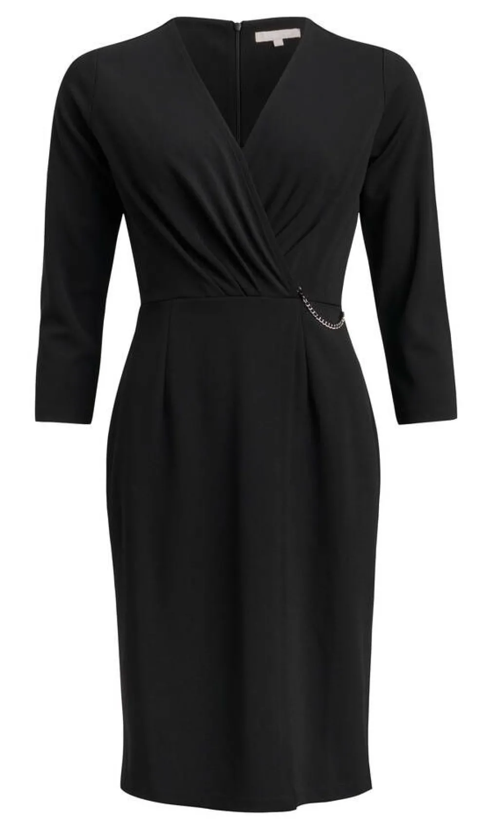 Tyylikäs joustava kietaisumallinen mekko selkäpuolen vetoketjukiinnityksellä. Mekossa on 7/8-hihat ja irrotettava met…