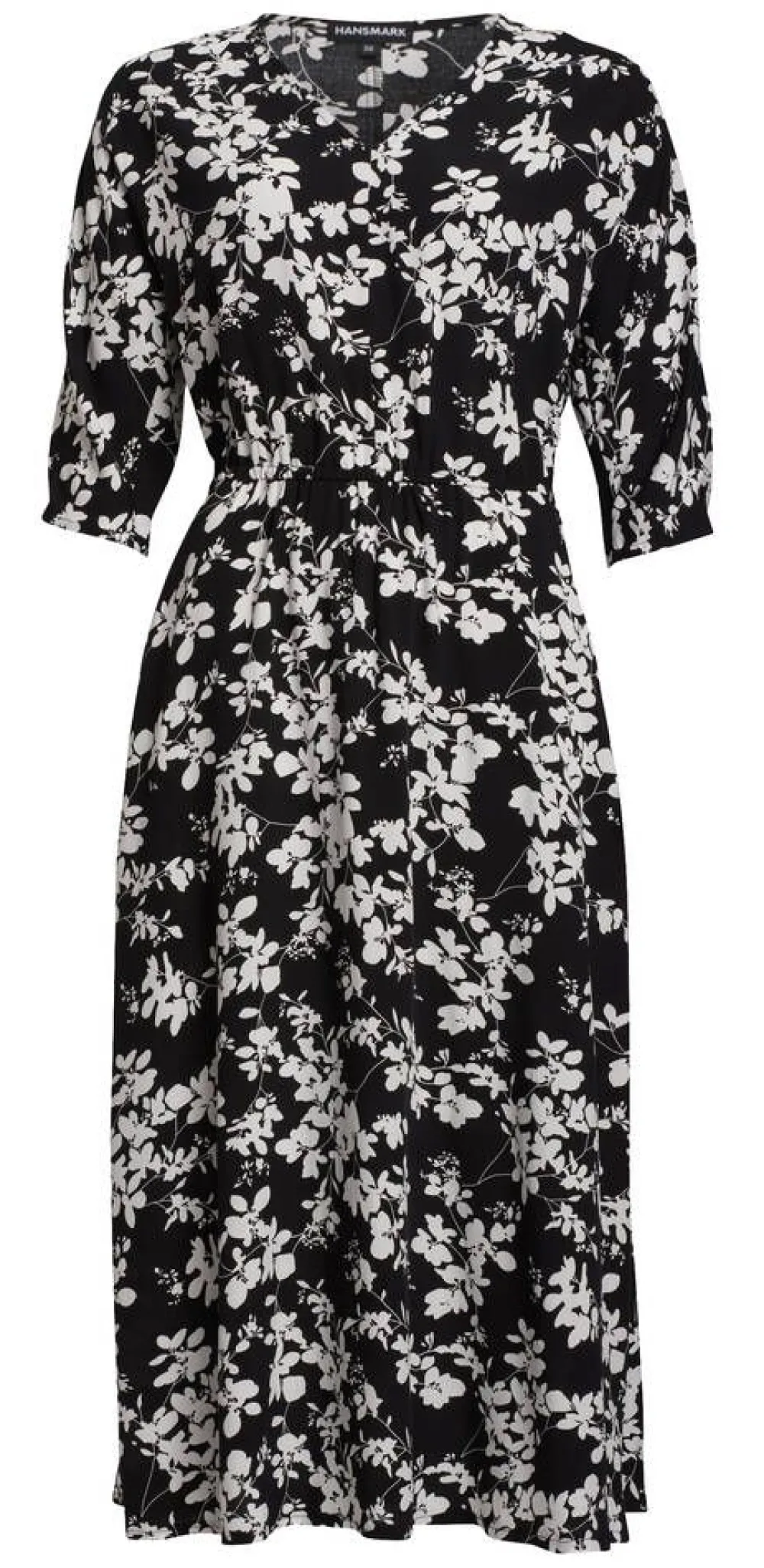 Naisten kukallinen viskoosimekko joustavalla vyötäröllä, v-pääntiellä ja vajaamittaisilla hihoilla. Mekossa on vy…