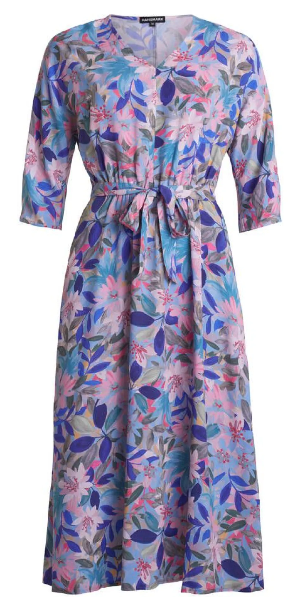 Naisten pohjepituinen viskoosimekko V-pääntiellä ja vajaamittaisilla 3/4-hihoilla. Vyötäröllä on muotoa antava ku…