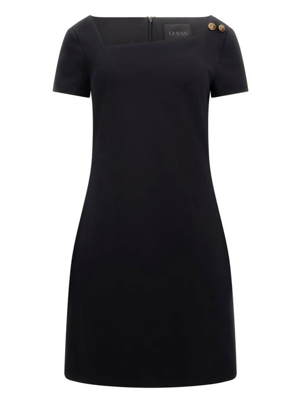 Naisellinen ja trendikäs minimekko näyttävällä vinoon leikatulla pääntiellä ja koristenapeilla. Selässä on vet…