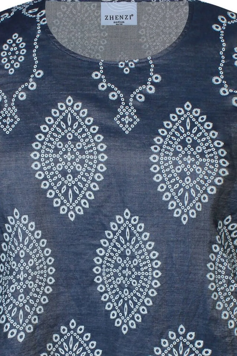 Kaunis tunikamekko brodeeratun näköisellä printillä ja 3/4-hihoilla. Mekon helmassa ja hihansuissa on piparkakkureun…