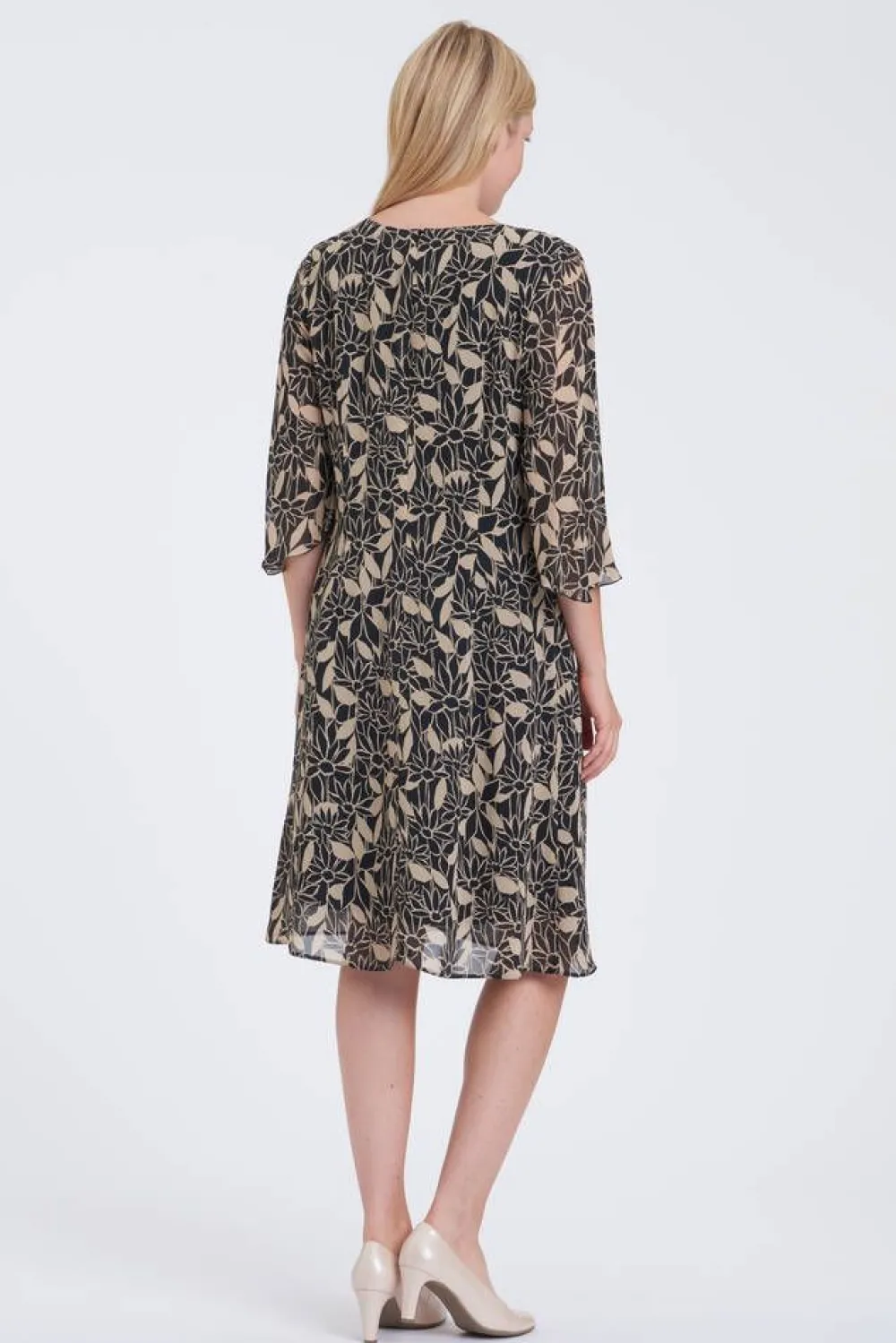 Kevyt kukallinen sifonkimekko läpikuultavilla 3/4-hihoilla. Selkäpuolella on pukemista helpottava vetoketjukiinnitys.L…