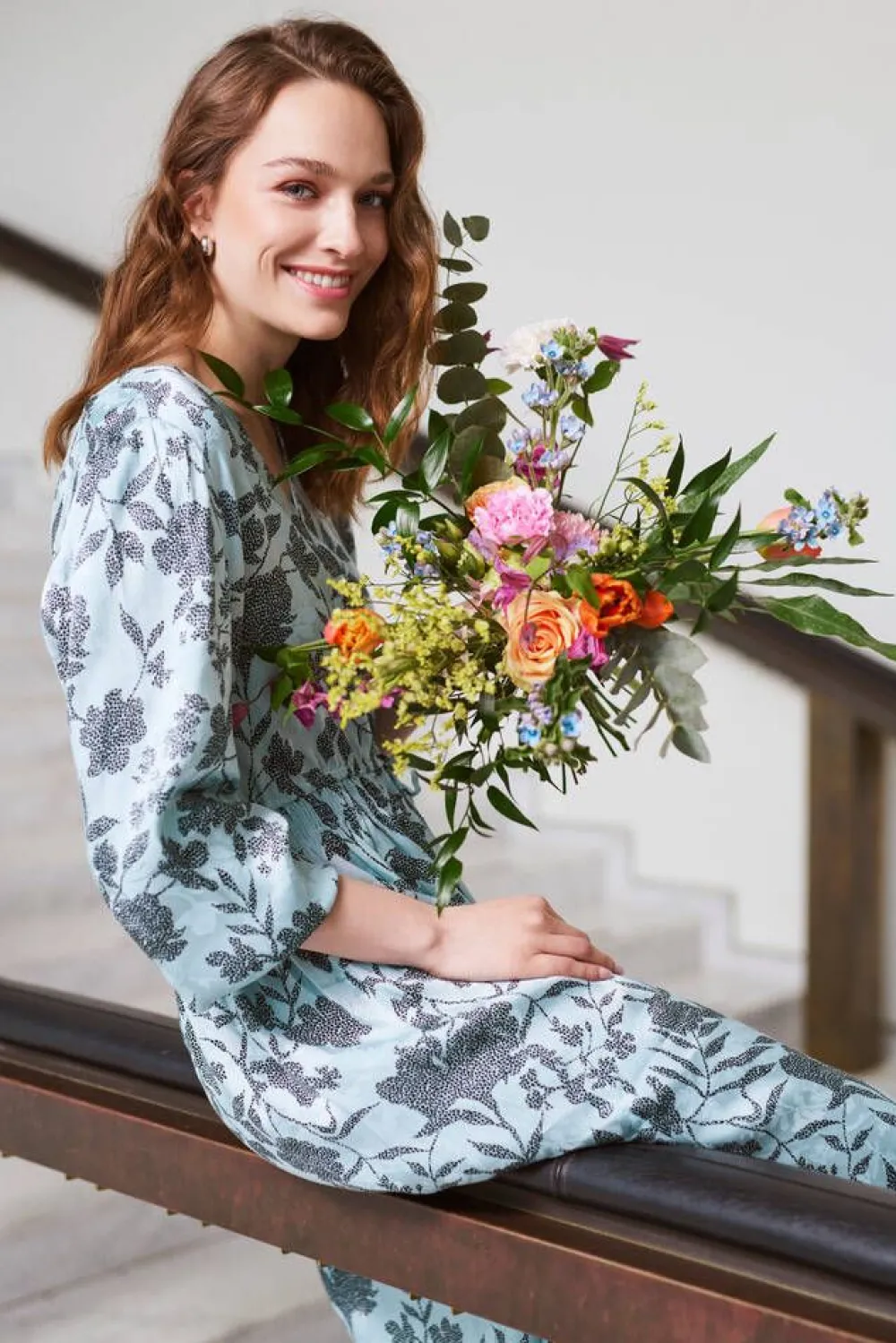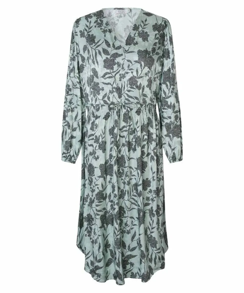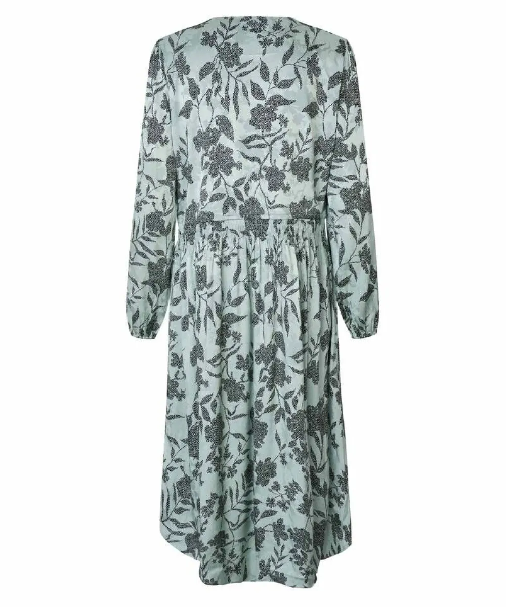 Raikas jacquard-viskoosikankaasta valmistettu kiiltäväpintainen mekko kukkakuosilla. Vyötäröllä on solmittava naru…