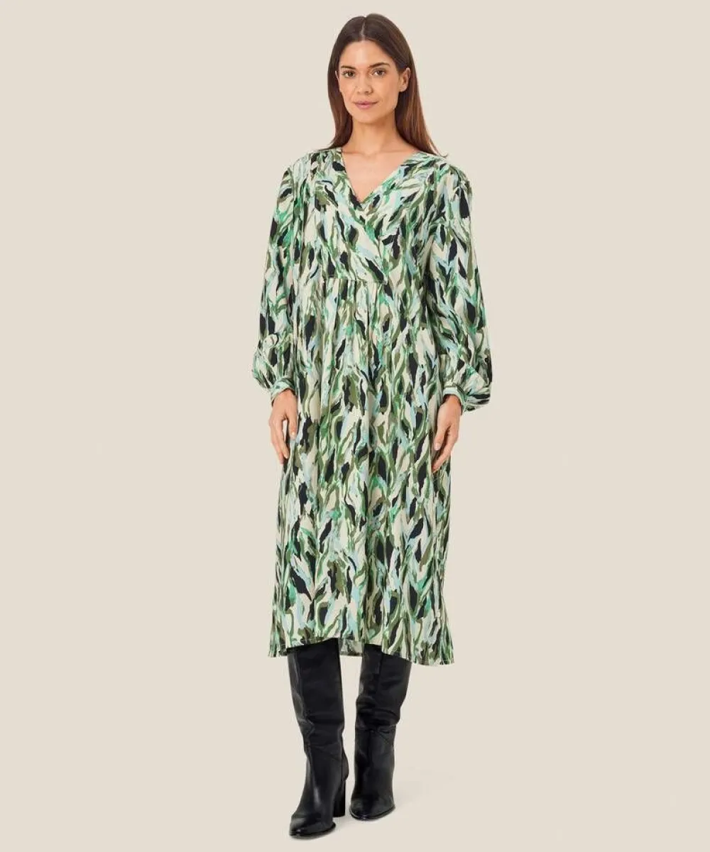 Pitkähihainen mekko raikkaalla lehtikuosilla. A-linjainen leikkaus ja eläväinen vihreän sävyissä oleva printti luo…
