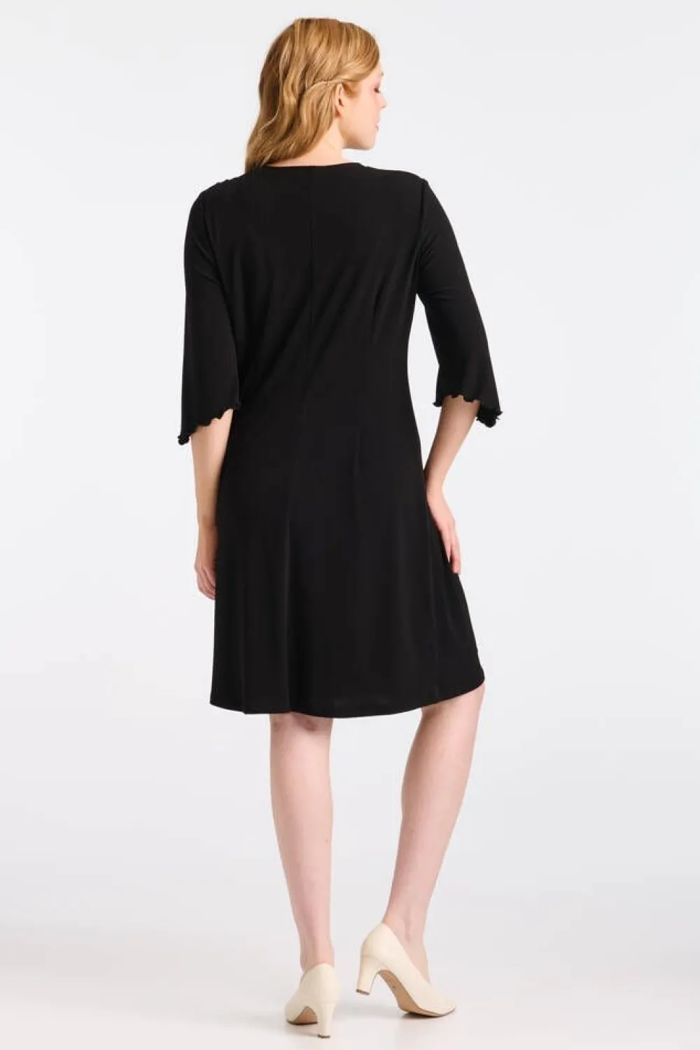 Elegantti musta mekko joustavaa kangasta. Pääntiellä on runsaat naiselliset vesiputouslaskokset. Mekossa on myös 3/4…