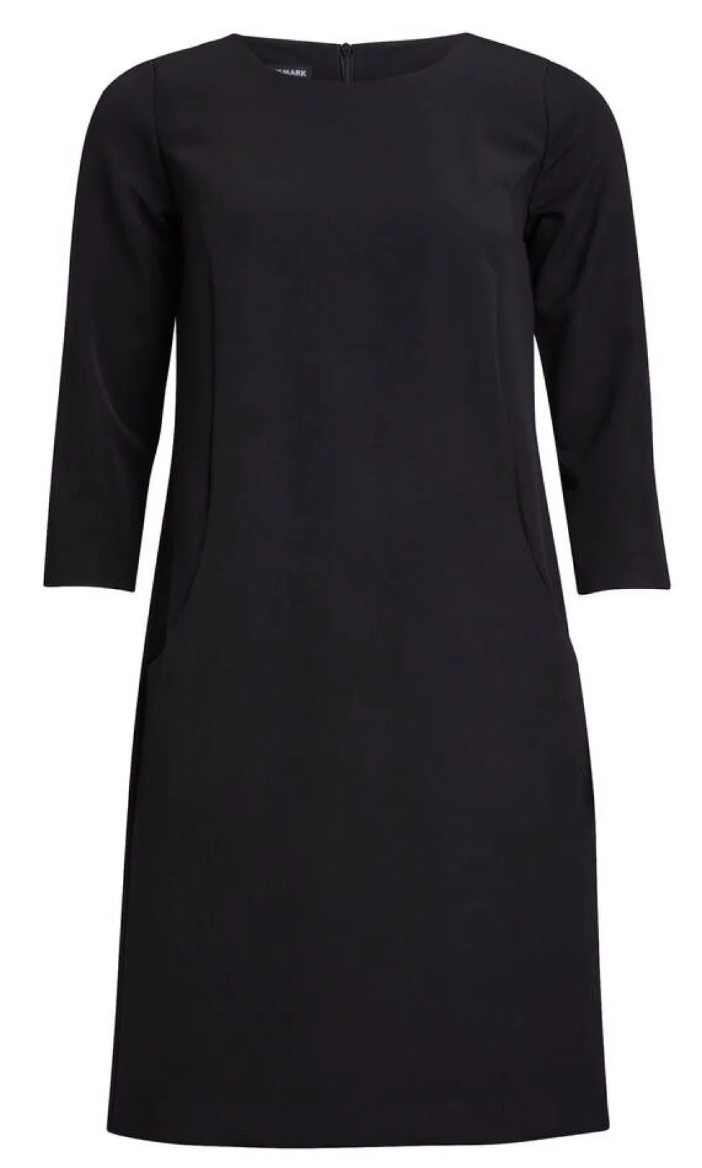 Ajaton yksivärinen kotelomekko vajaamittaisilla 3/4-hihoilla ja selkäpuolen vetoketjukiinnityksellä. Edessä on sauma…