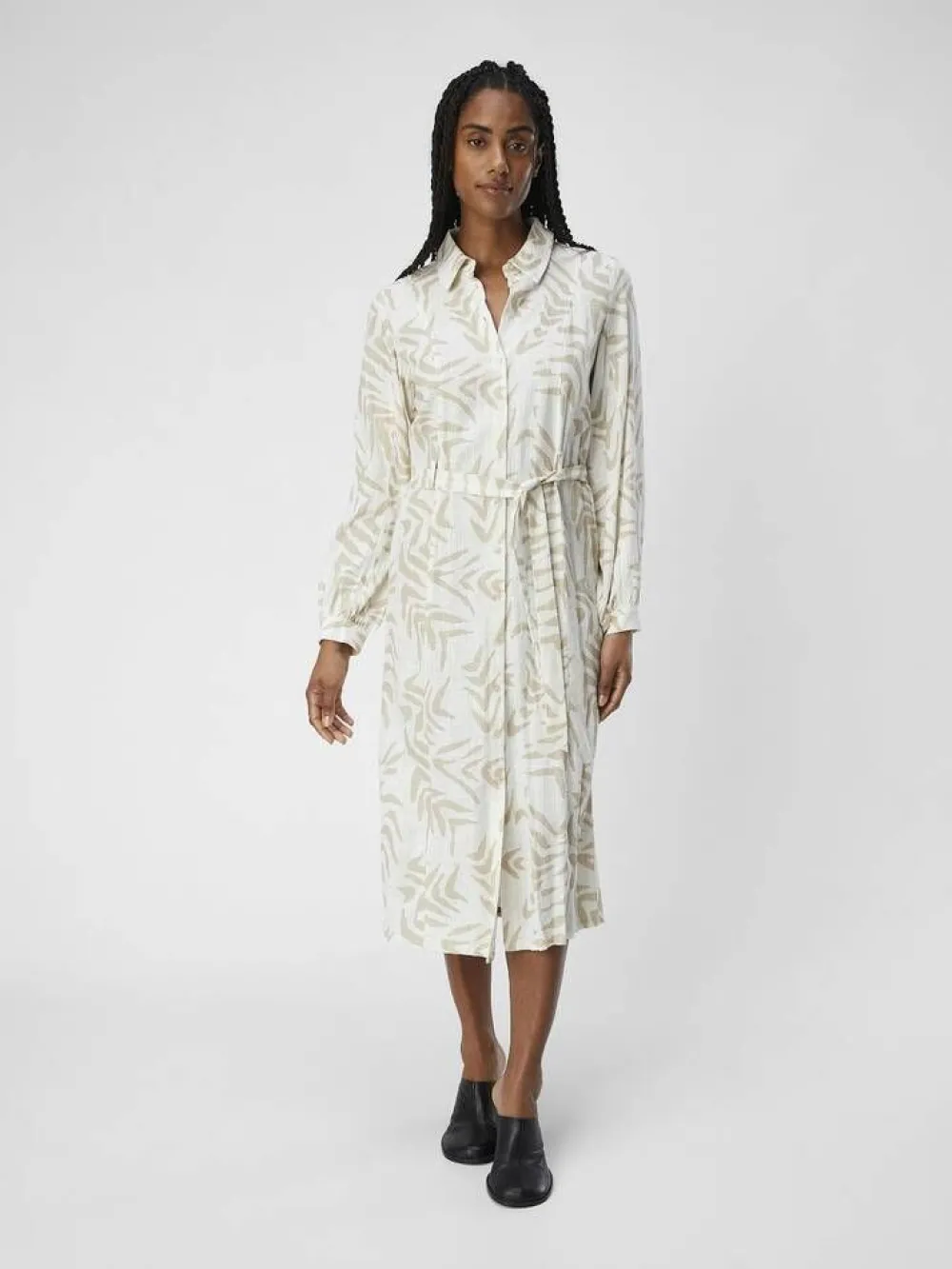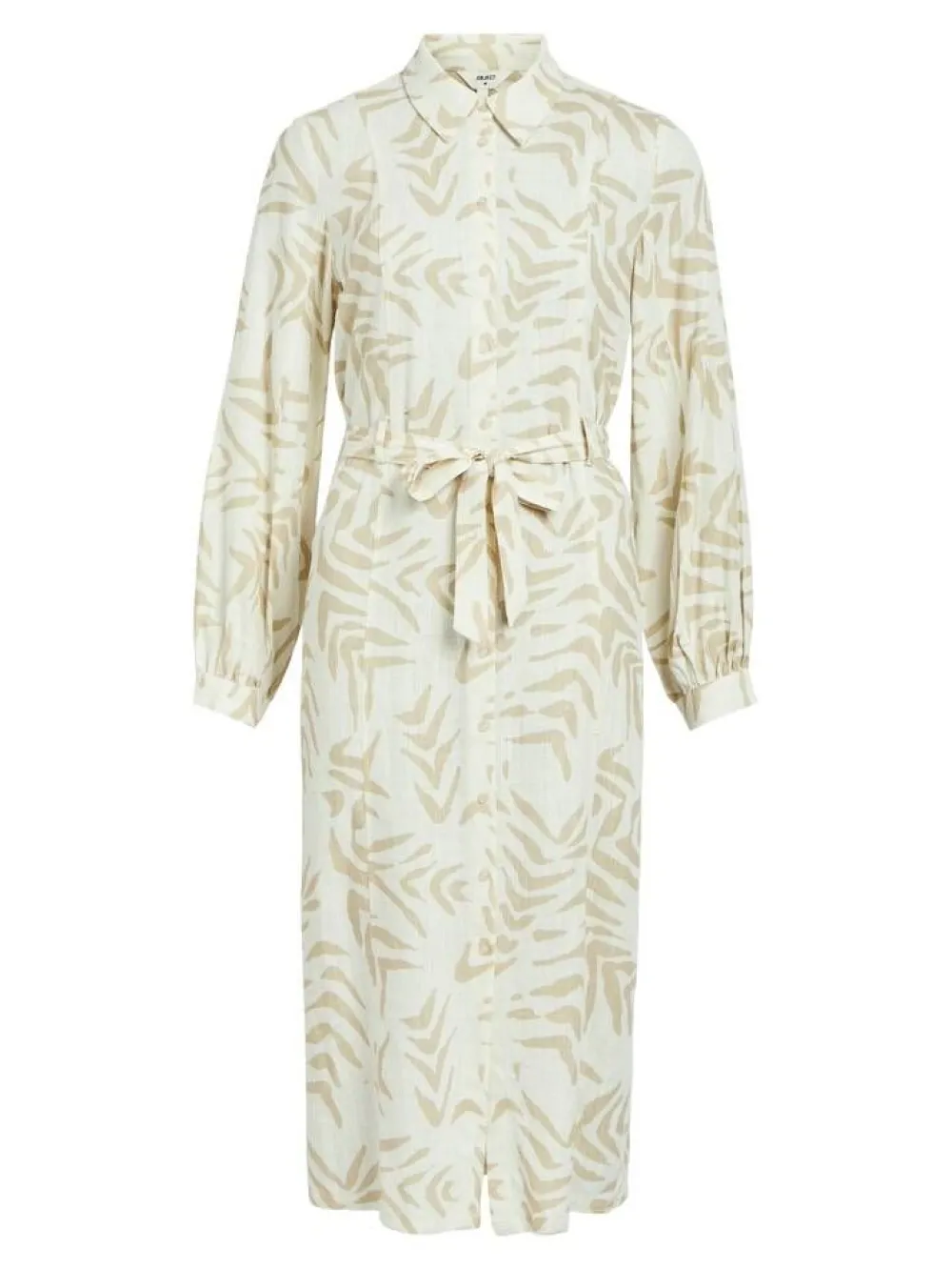 Mukava pellavasekoitemekko pitkillä hihoilla ja etupuolen nappikiinnityksellä. Kuvioidun mekon vyötäröllä on solmi…