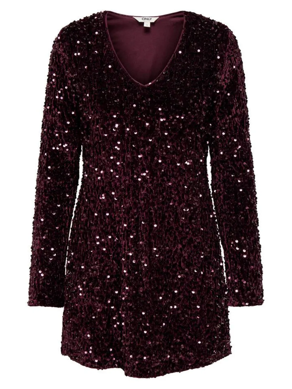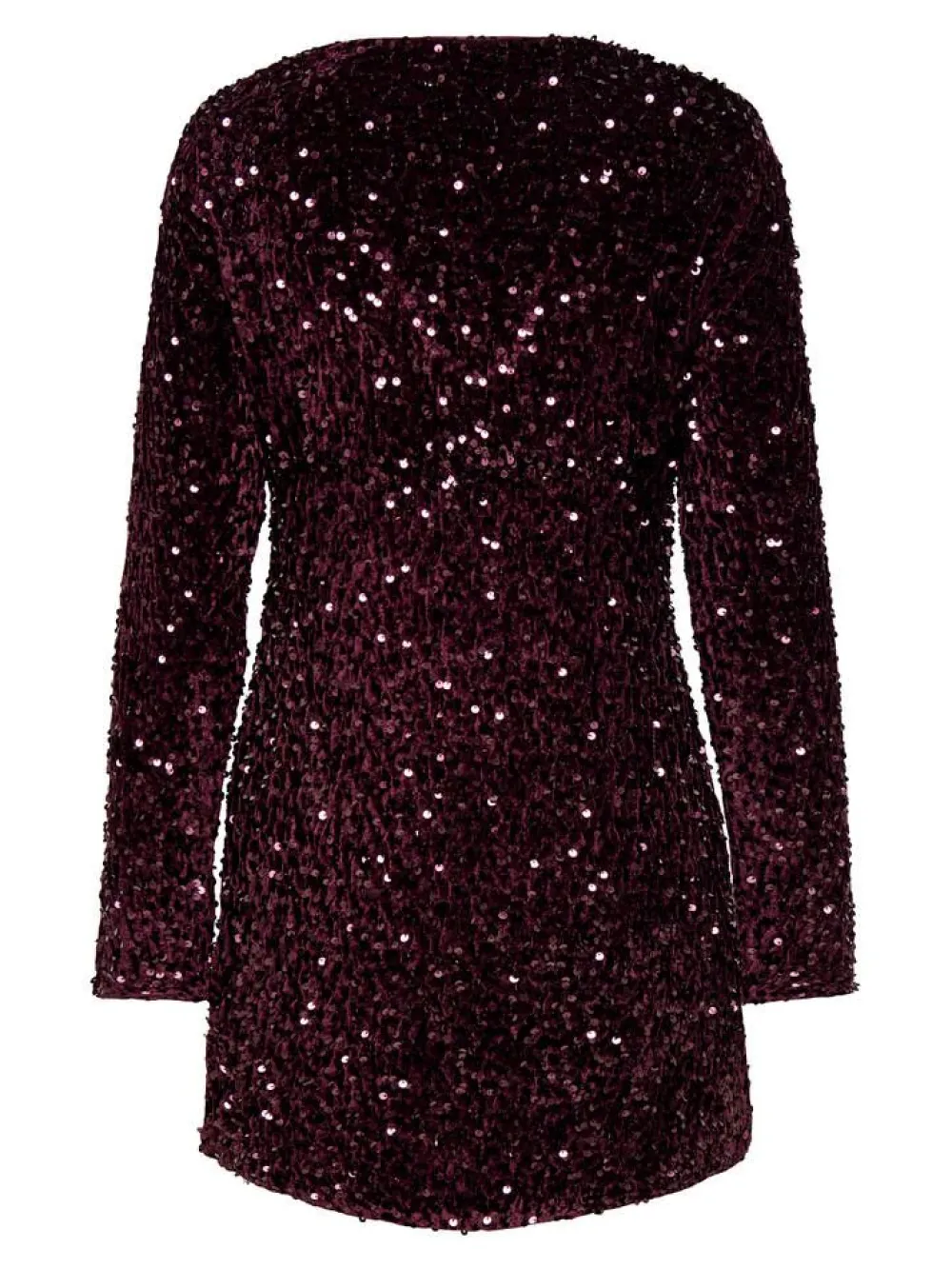 Juhlakauden trendikäs mekko naisellisella v-pääntiellä ja pitkillä hihoilla. Hienostuneet paljetit heijastavat juur…
