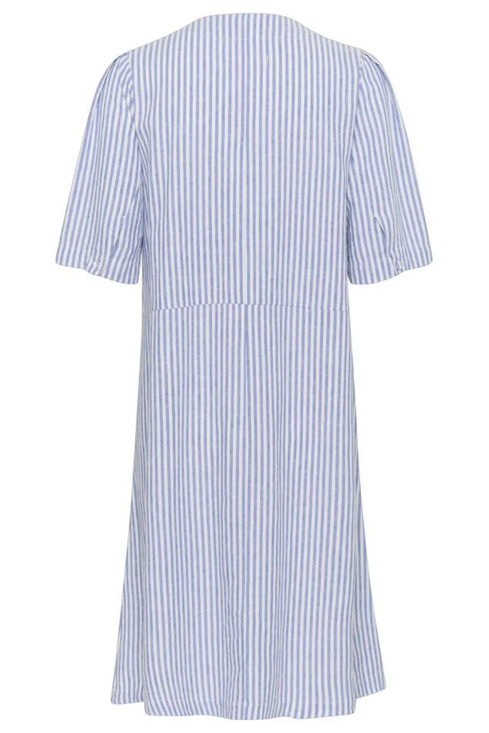 Ihana kesäinen pellavasekoitteinen mekko polvipituisella helmalla. Vaaleat pystyraidat ja poikkisauman alle muodostuva …