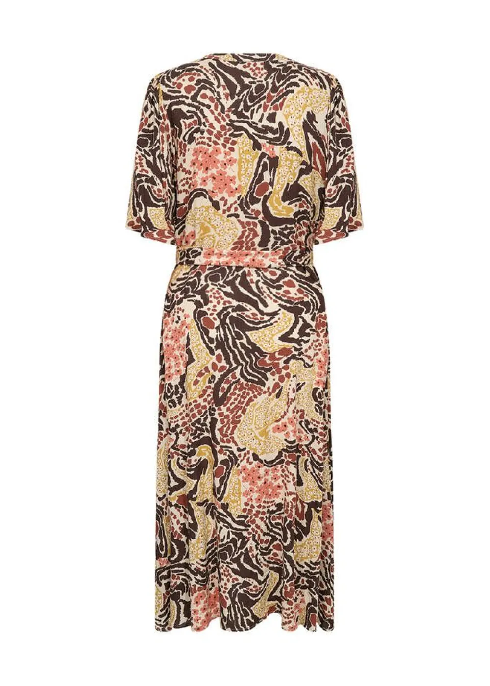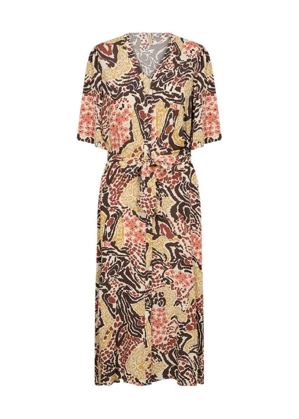 Tyylikäs midimittainen mekko imartelevalla v-pääntiellä. Mekossa on lyhyet enkelihihat, vyötäröä korostava kanga…