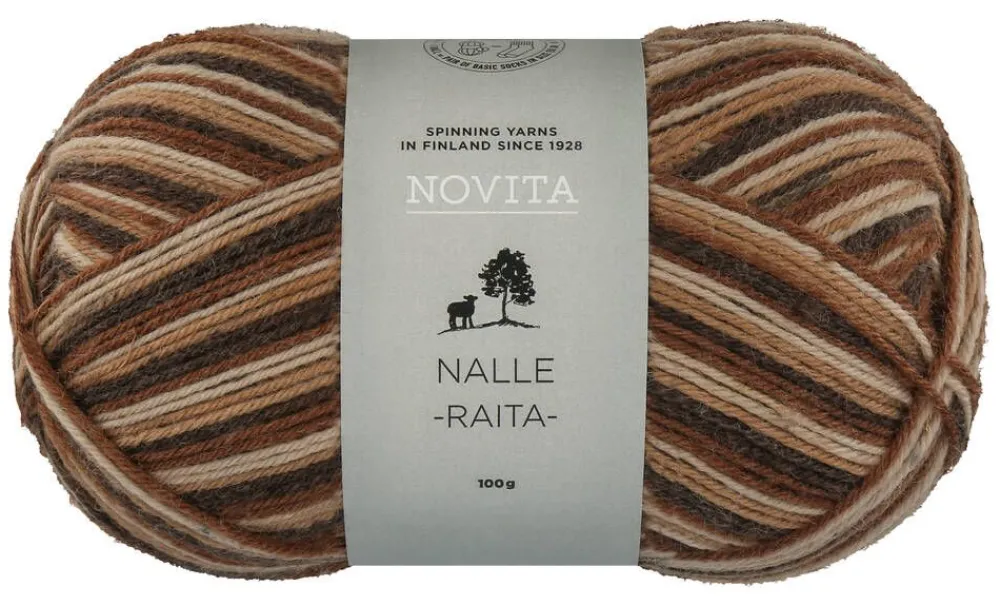 Nalle Raita -langasta saa koon 38 tasaraitasukat yhdestä kerästä. Koostumus on 80 % villaa ja 20 % polyamidia. Puikko…