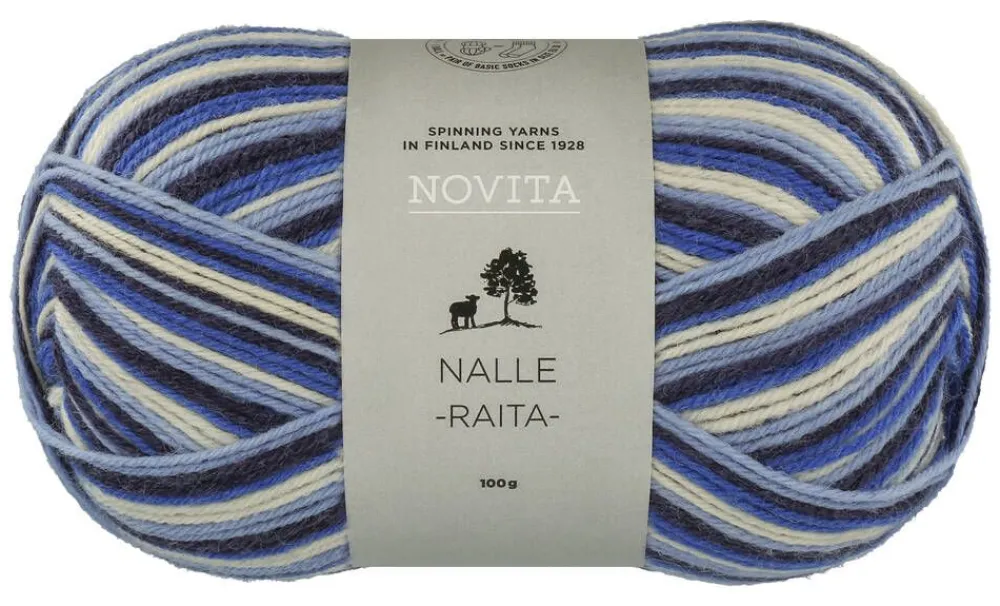 Nalle Raita -langasta saa koon 38 tasaraitasukat yhdestä kerästä. Koostumus on 80 % villaa ja 20 % polyamidia. Puikko…