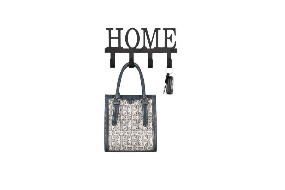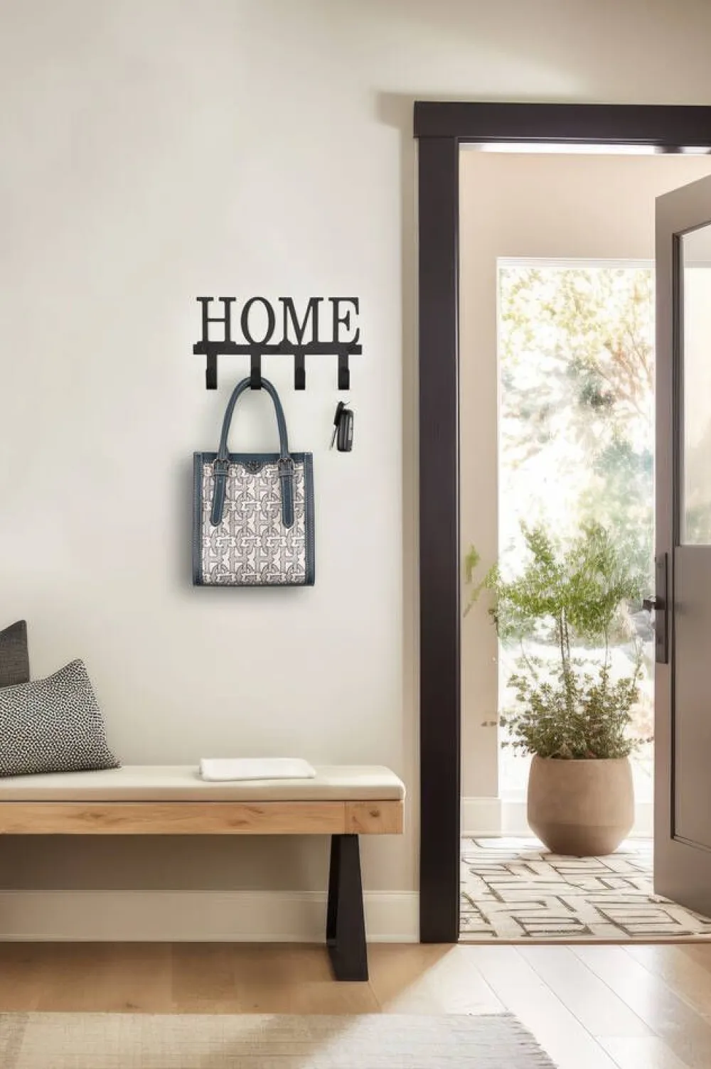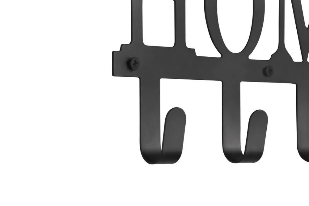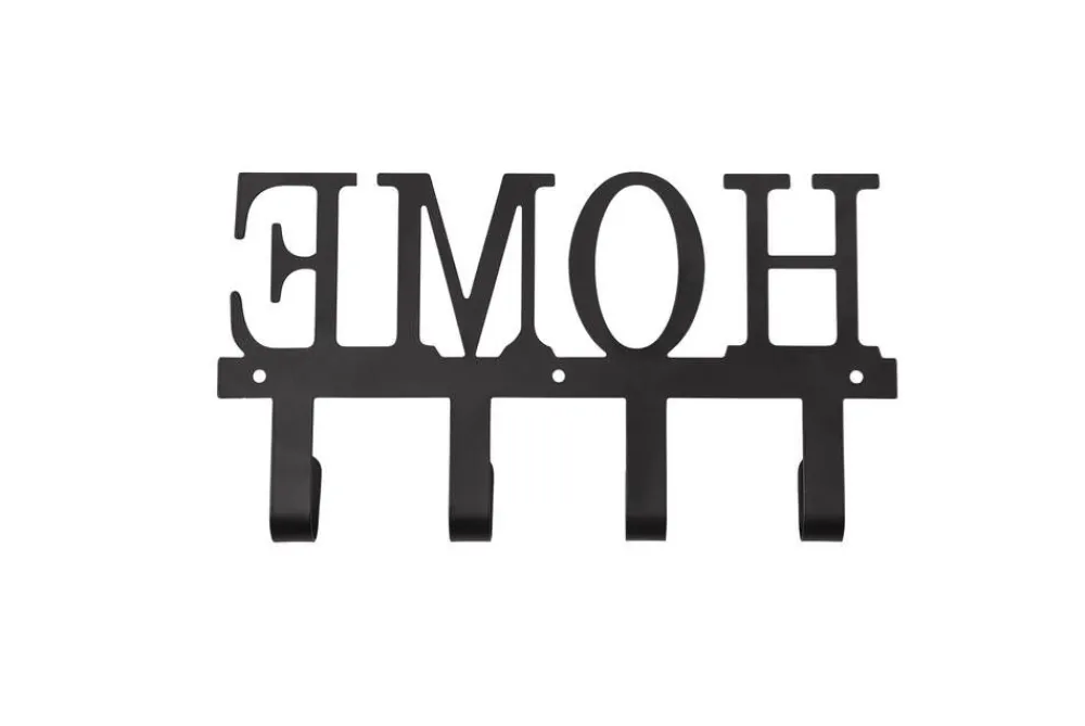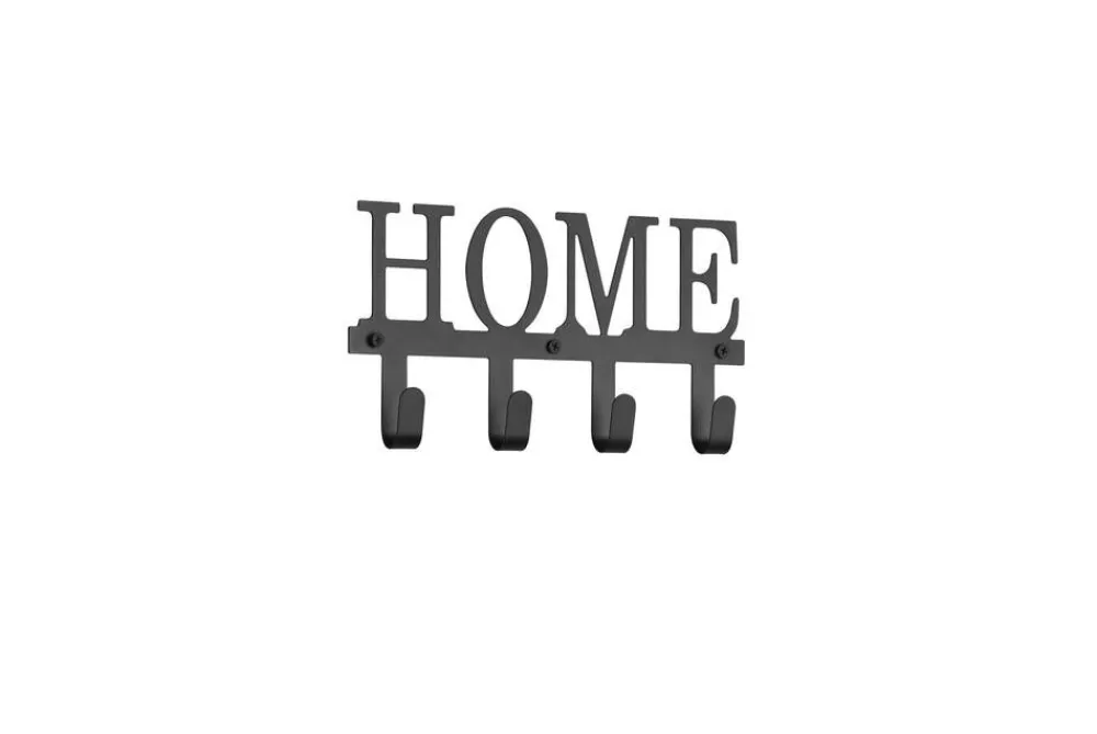 Nici-naulakon HOME-teksti toivottaa tervetulleeksi kotiin. Naulakon muuten yksinkertainen tyyli korostaa koukkujen yllä…