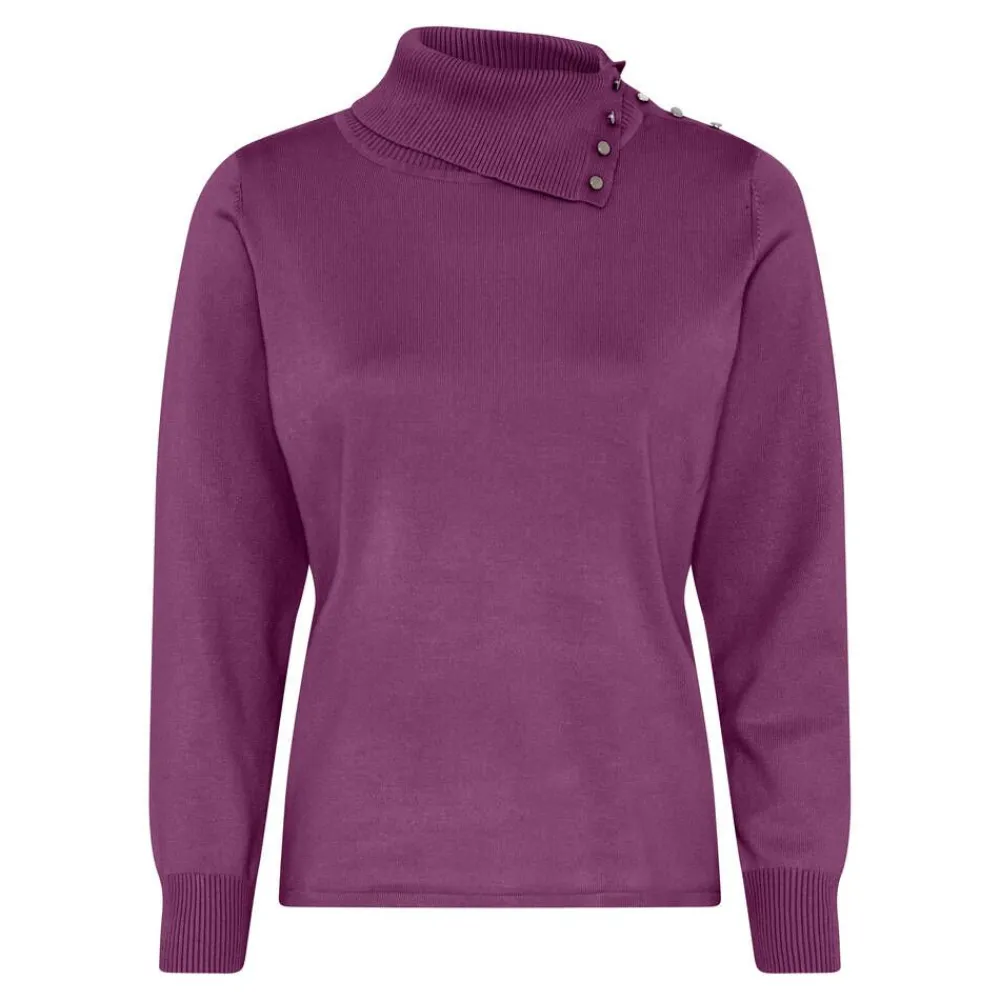 Tyylikäs yksivärinen neule, jossa on toiselta sivulta avoin poolokaulus näyttävillä koristenapeilla.Lisää tietoja…