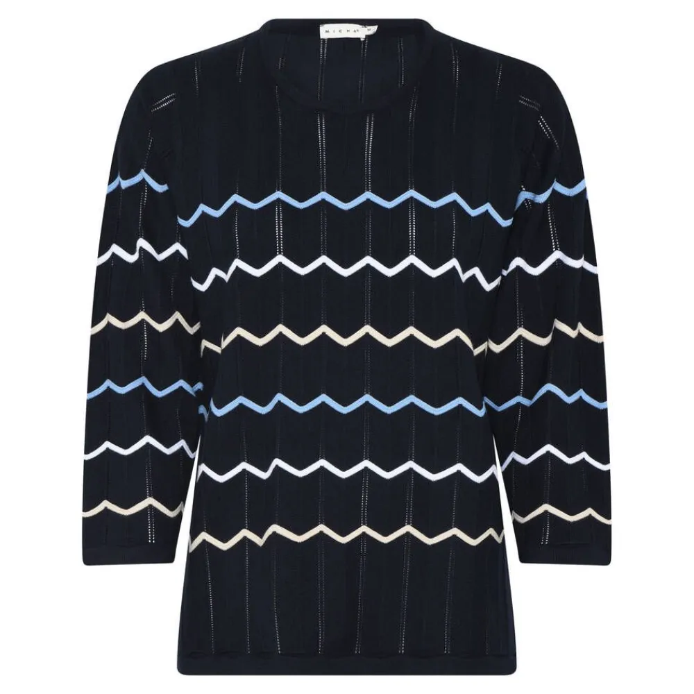 Tyylikäs neulepaita raikkaan sävyisillä vaakasuuntaisilla siksak-raidoilla. Neuleessa on pyöreä pääntie ja vajaam…