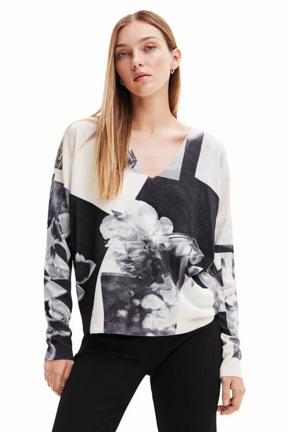Mustavalkoinen printtineule V-pääntiellä ja pitkillä hihoilla.Lisää tietojaHoito-ohje:Vesipesu 30Materiaali:82% vi…
