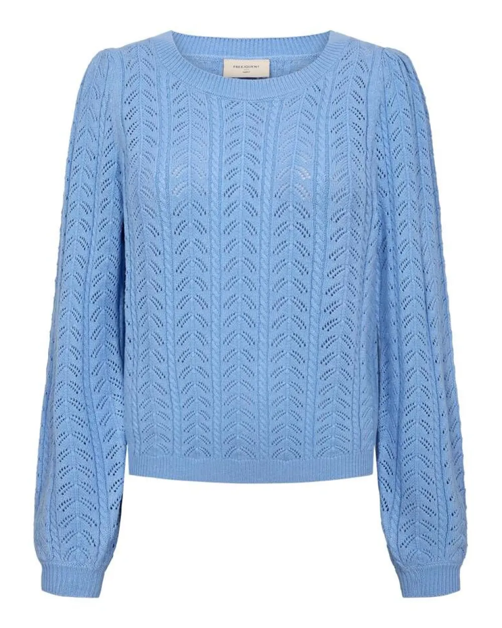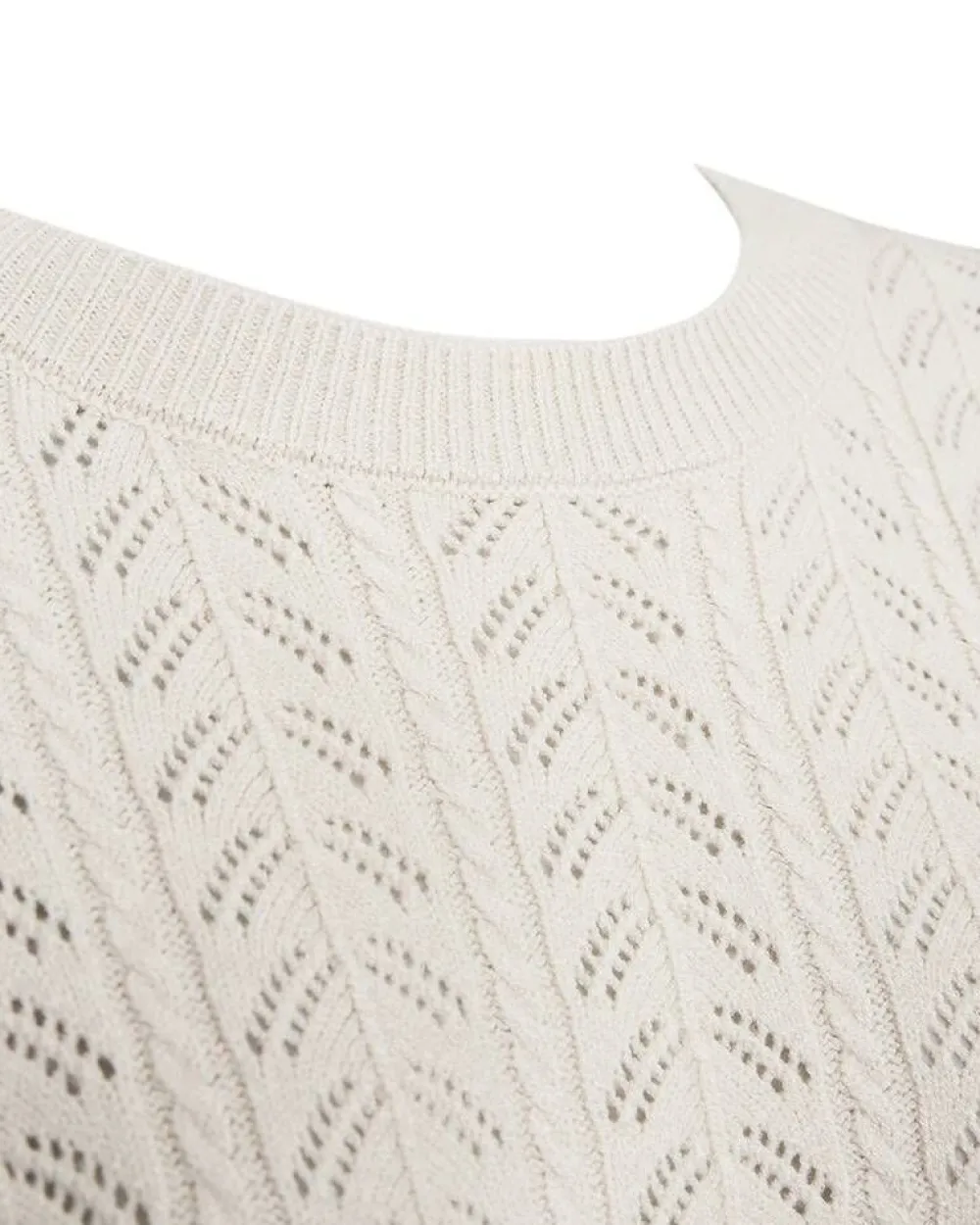 Pehmeä neule pyöreällä pääntiellä ja kauniilla pitsineuloksella. Kevyt poimutus olkapäillä. Materiaali tuntuu m…