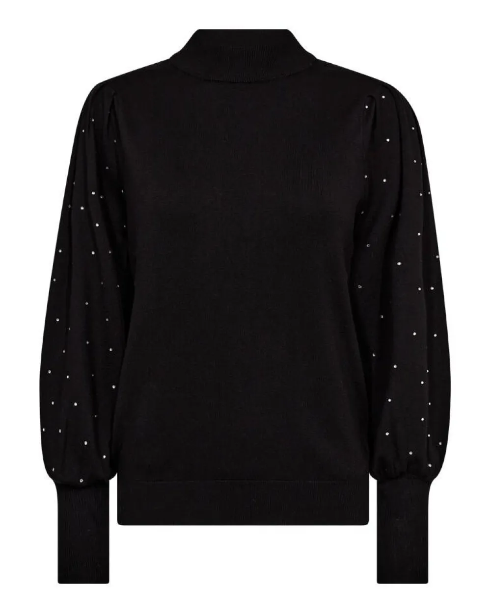 Elegantti neulepusero korkealla pääntiellä ja pitkilllä puhvihihoilla, joissa on kauniisti kimaltavat hot-fix strass…