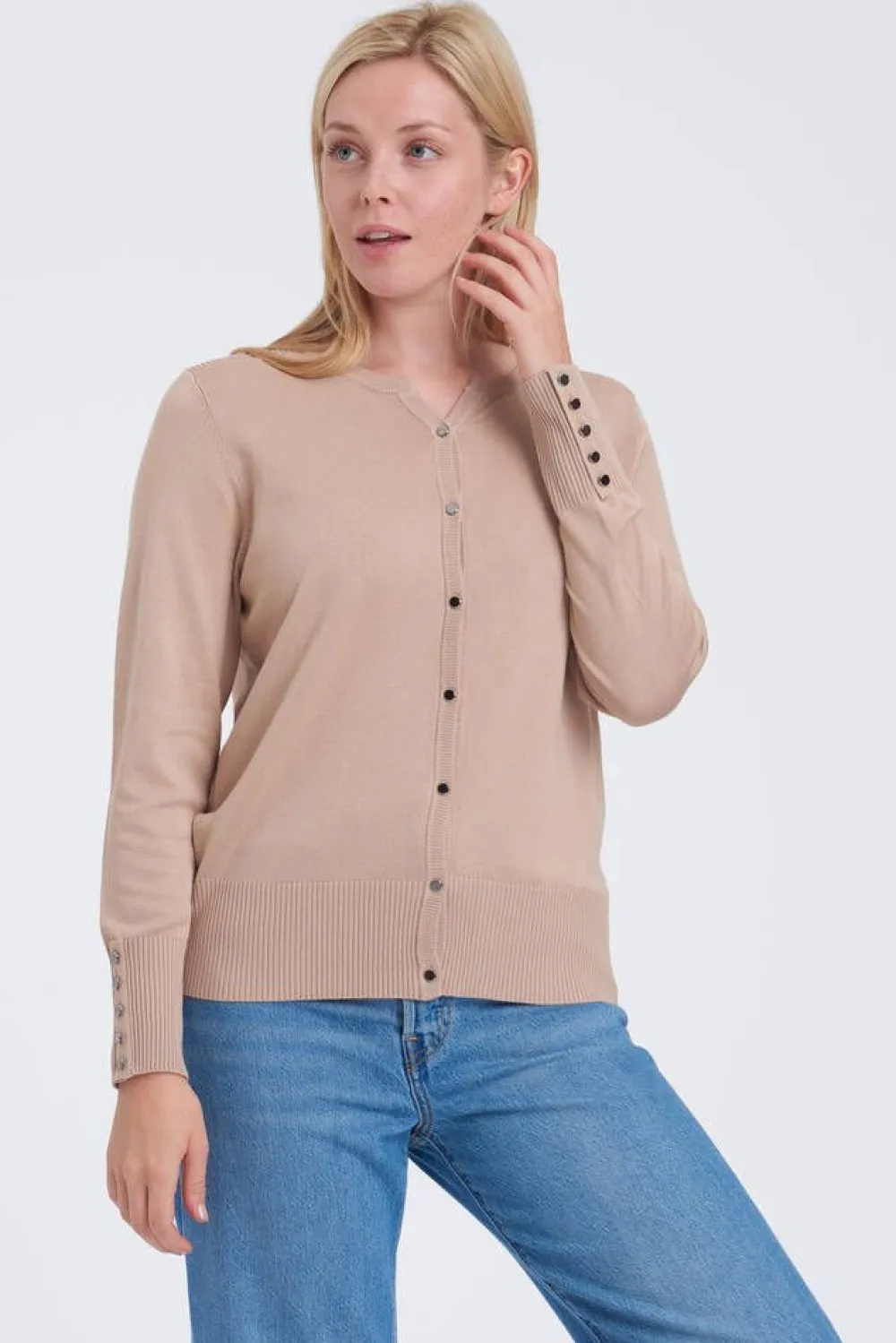 Naisten neuletakki, jossa on ribbineulosta olkapäillä ja resoreissa. Neuletakissa on metalliset napit kiinnitykseen se…