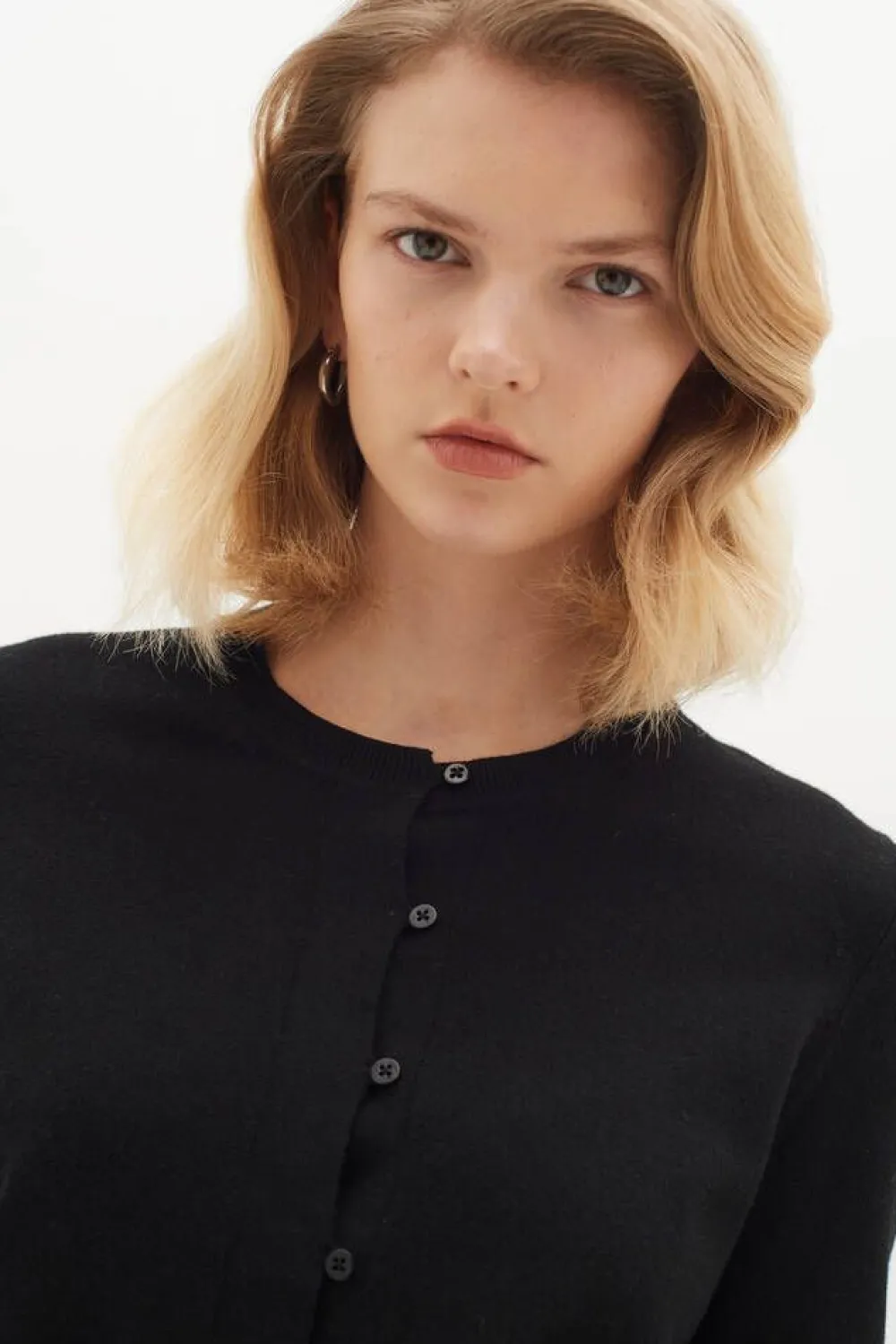 Yksivärinen neuletakki O-pääntiellä ja pienillä napeilla.Lisää tietojaHoito-ohje:Vesipesu 30Kiinnitys:NappiMateri…