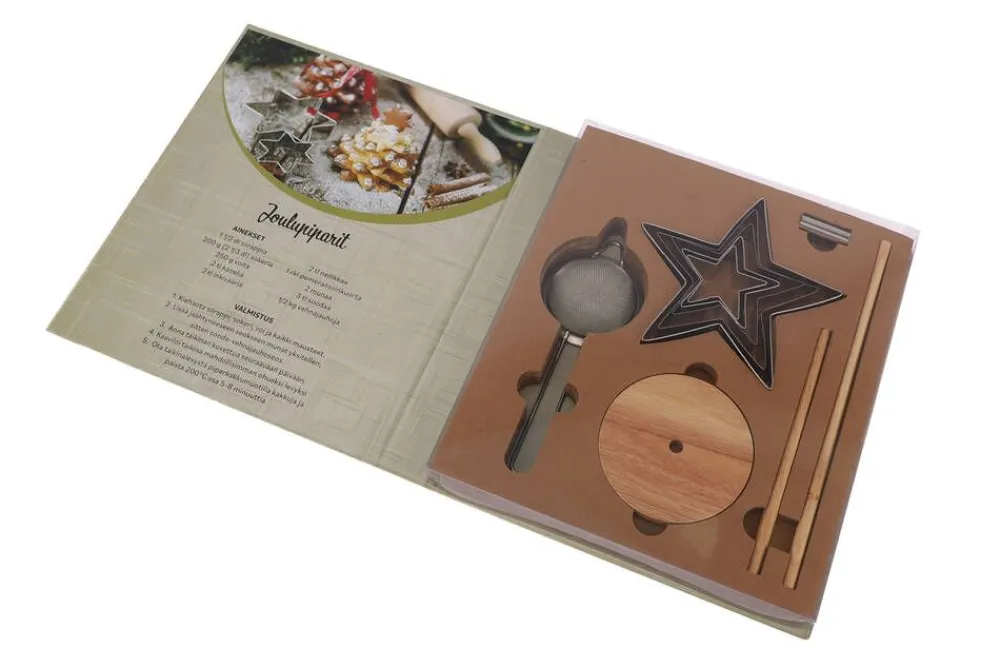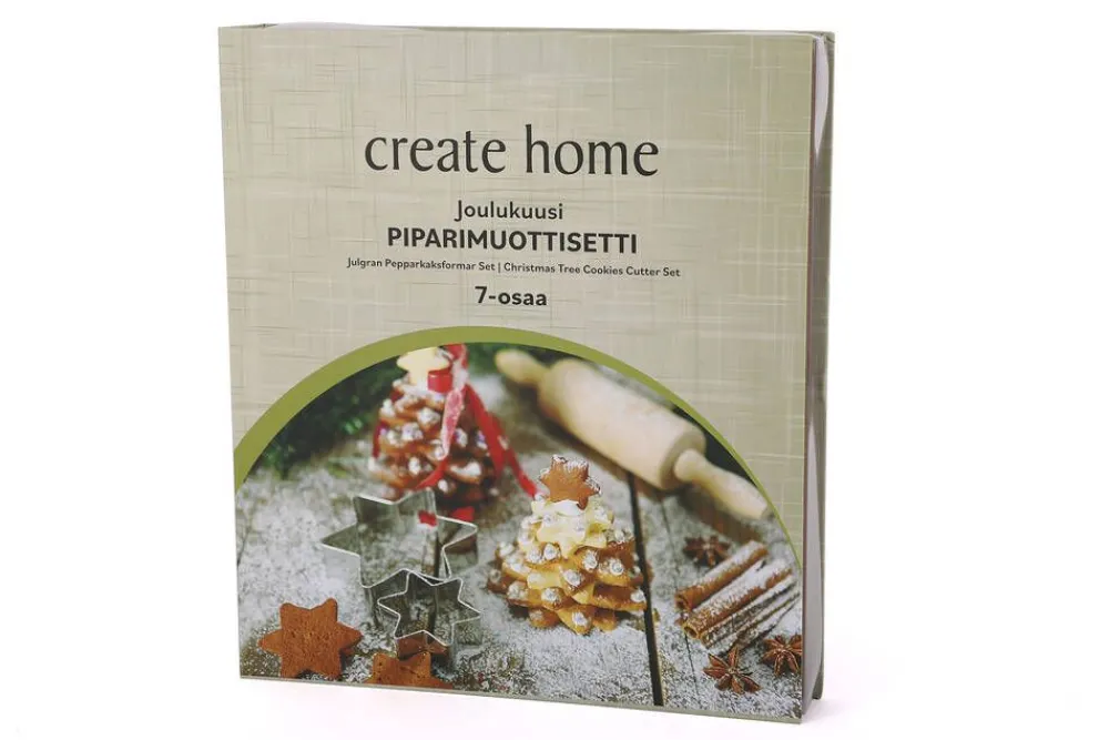 | Yhden myyntipakkauksen sisältö:Viisi tähtipiparimuottia Ø 6,8,10,13 ja 16 cm. Puinen jalusta Ø 11 cm, puinen keskitappi 28,5/19,5 cm. Siivilä. |