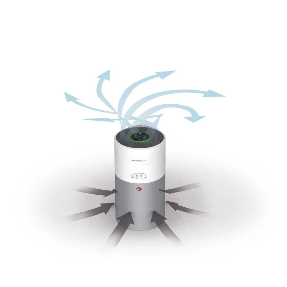 | Hoover H-purifier 300:lla puhdistettu ilma virtaa tehokkaasti huoneessa joka suuntaan, myös suurissa tiloissa. Kun allergeenit ja epäpuhtaudet on saatu kiinni, suodatettu ilma levitetään ensin kohti kattoa ja sitten ympäri huonetta nopeasti ja tehokkaasti. |