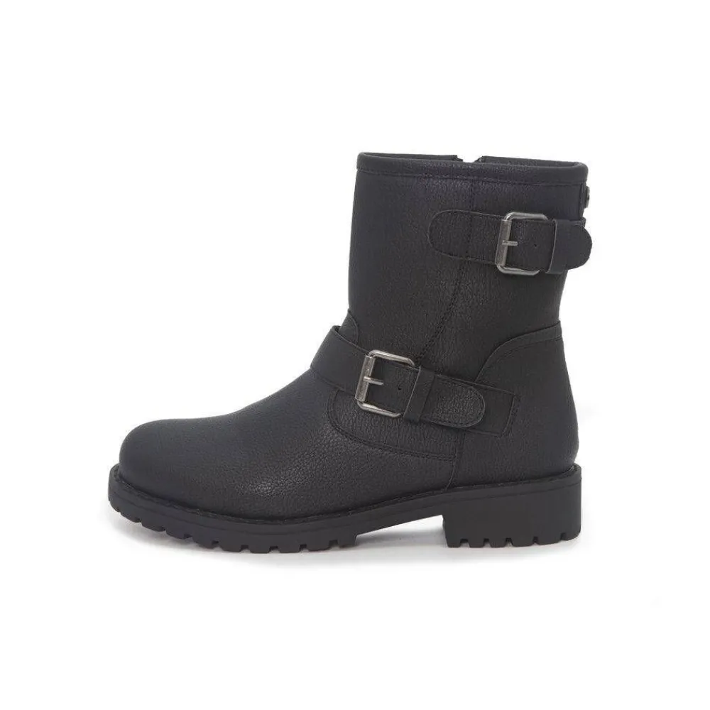 Naisten mustat biker-tyyliset nilkkurit koristeellisilla soljilla. Nilkkurissa on lämmin karvavuori ja -sisäpohja, sek…