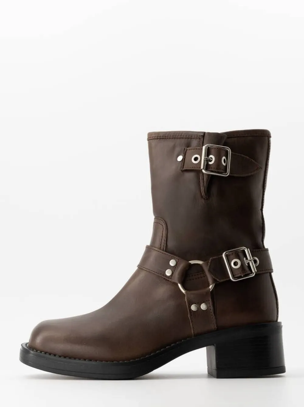 Klassisen tyylikkäät nahkapintaset bikernilkkurit rouheilla solkiyksityiskohdilla. Tukeva matala korko antaa hienostun…