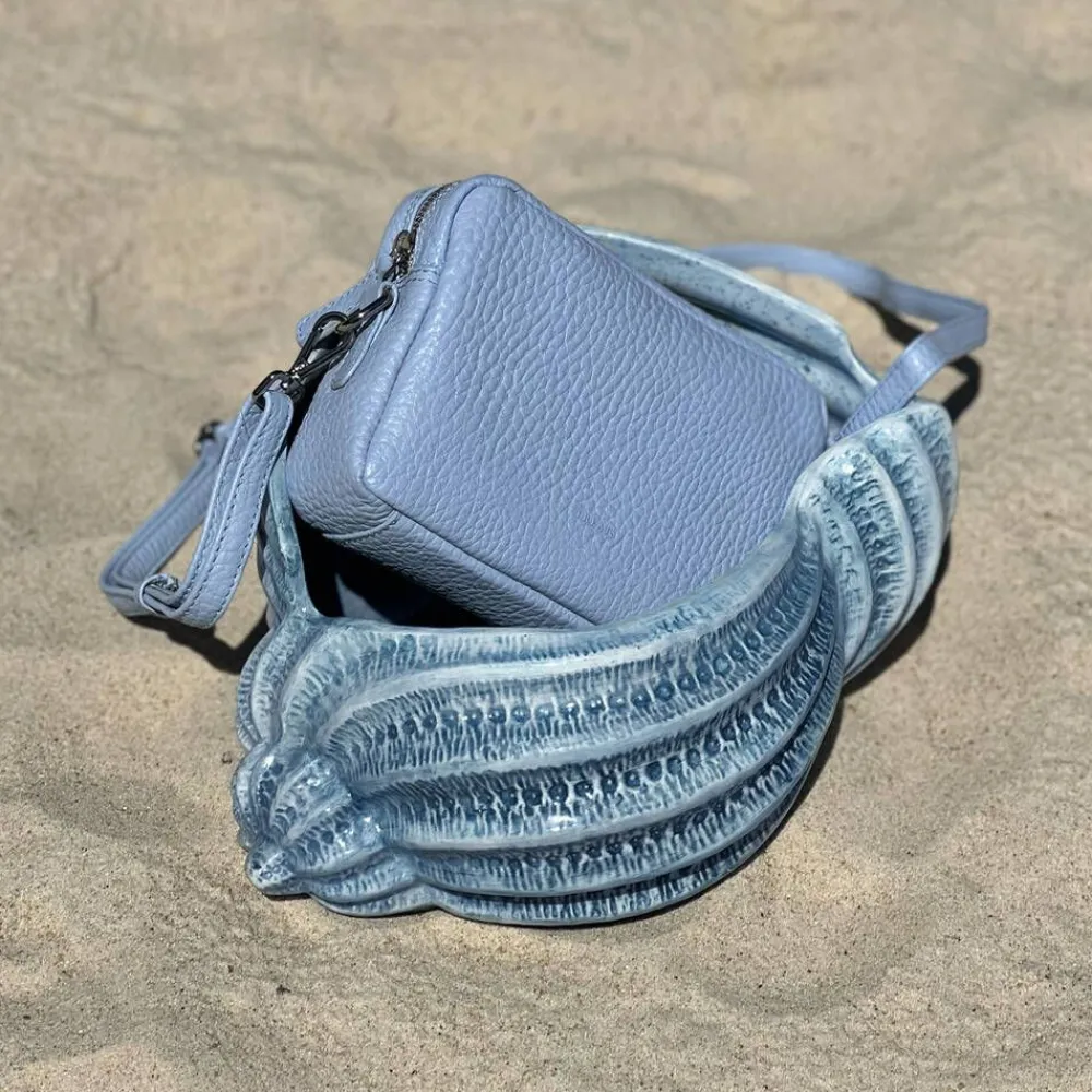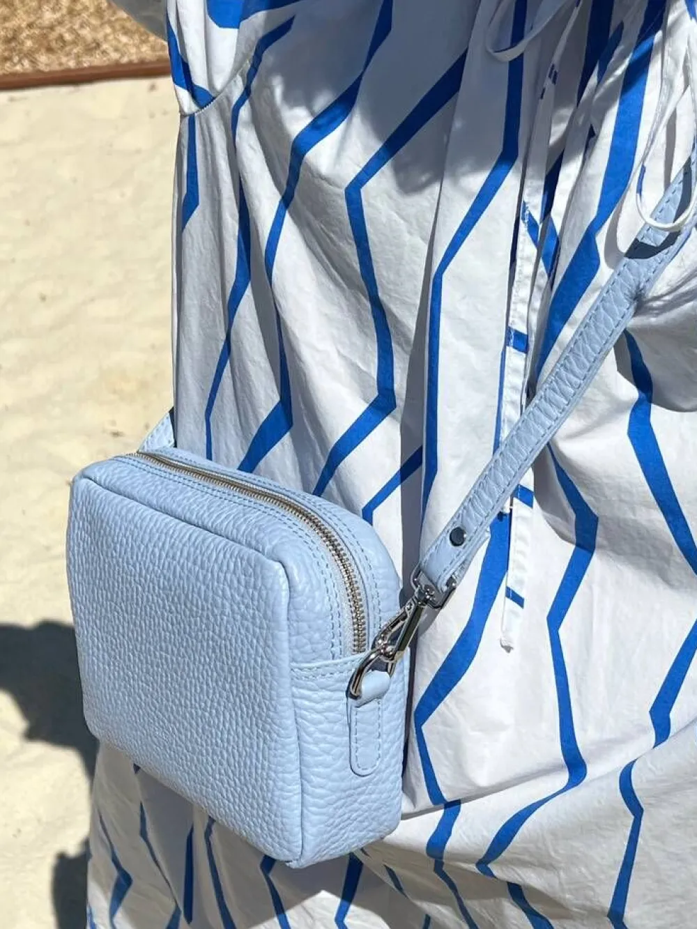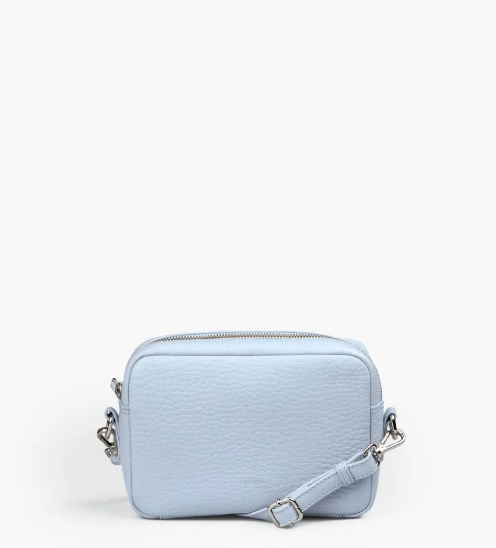 Vaaleansininen pintanahkainen olkalaukku hopeanvärisillä metalliyksityiskohdilla. Laukussa on säädettävä ja irroit…