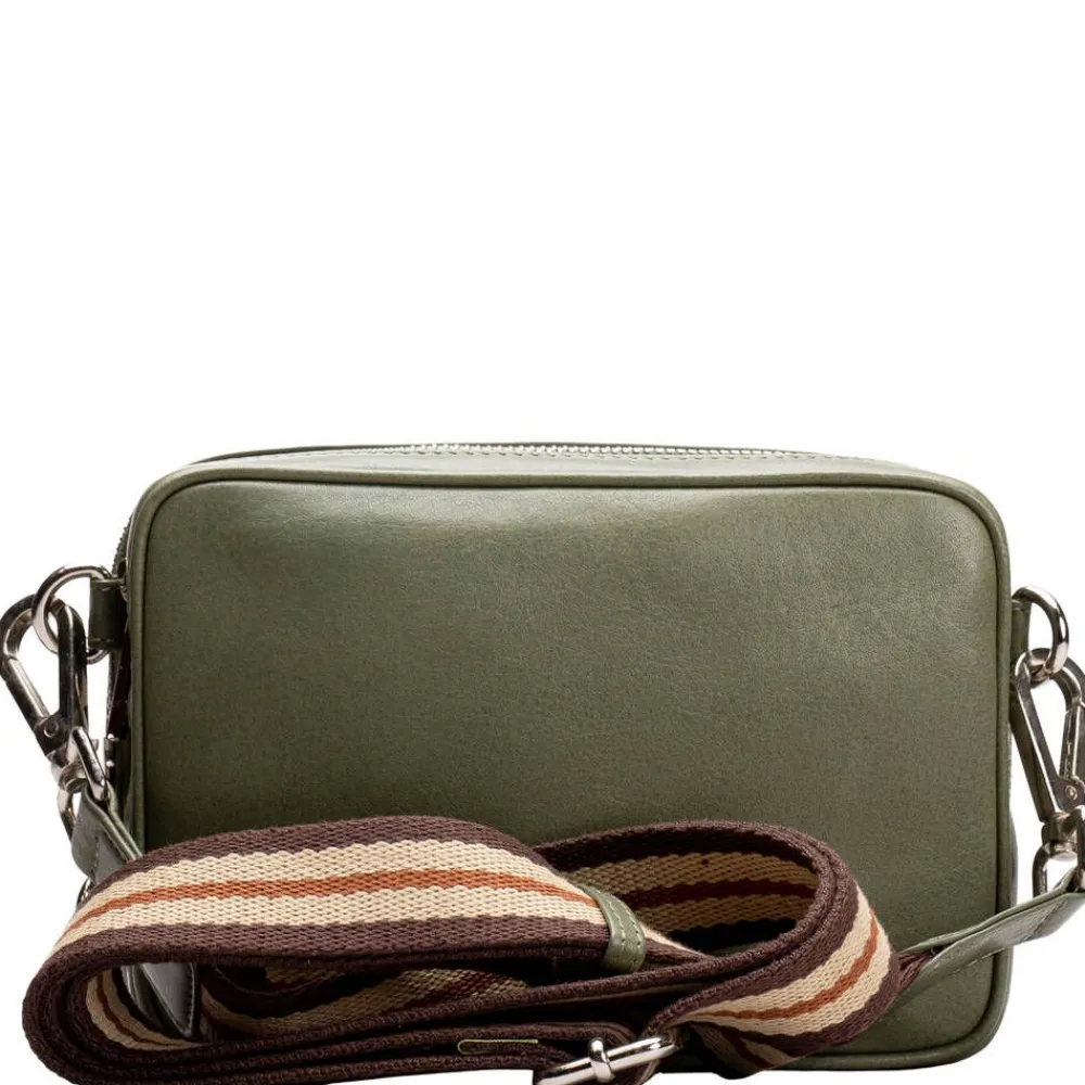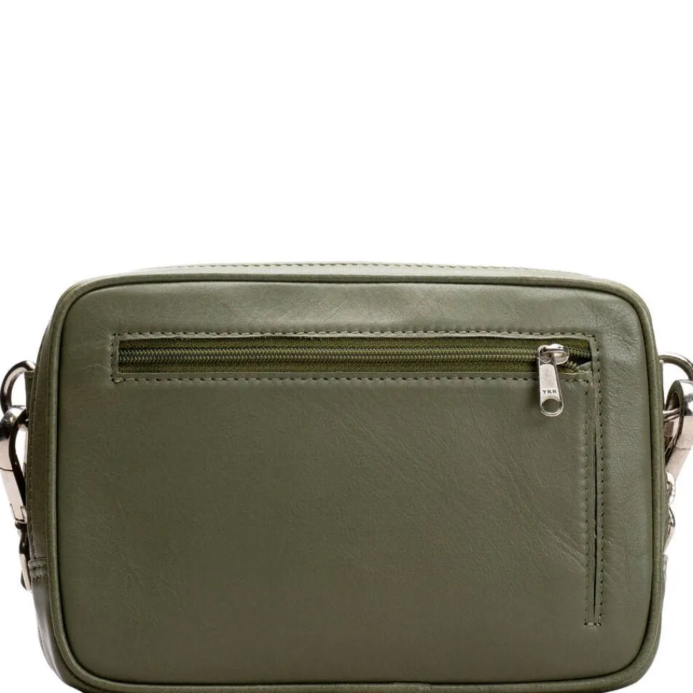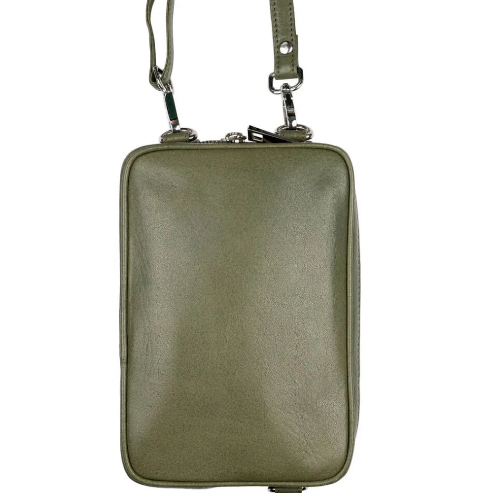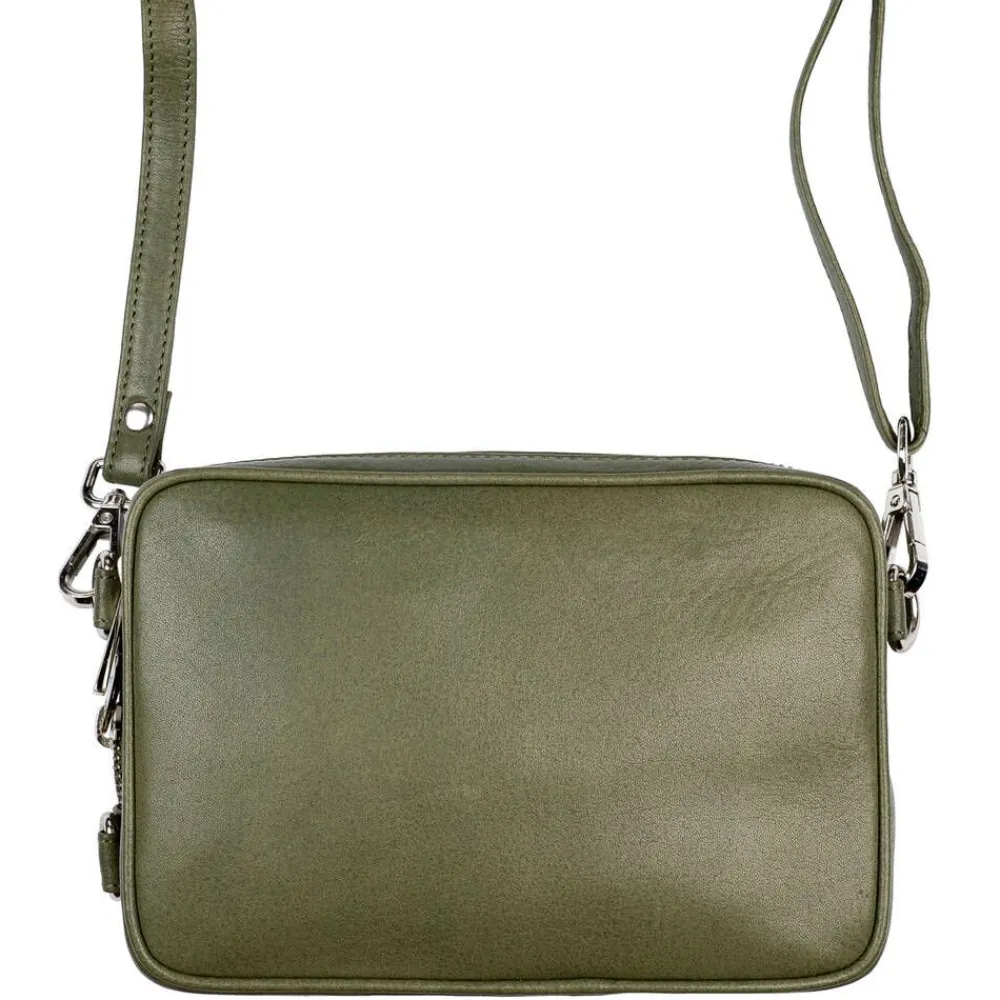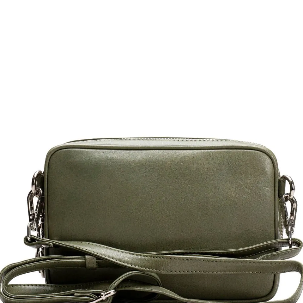 Monikäyttöinen pintanahkainen olkalaukku oliivinvihreässä sävyssä. Laukussa on kaksi vetoketjullista taskua sekä …